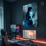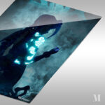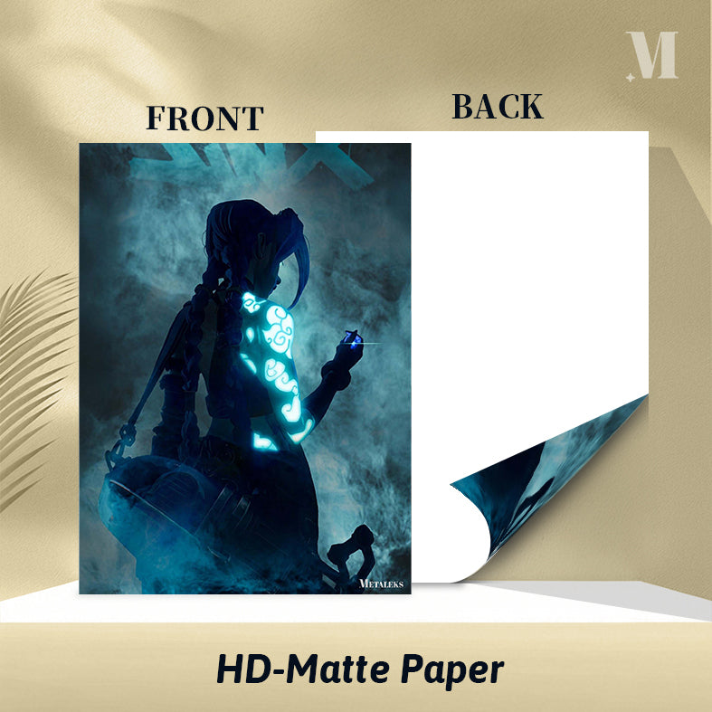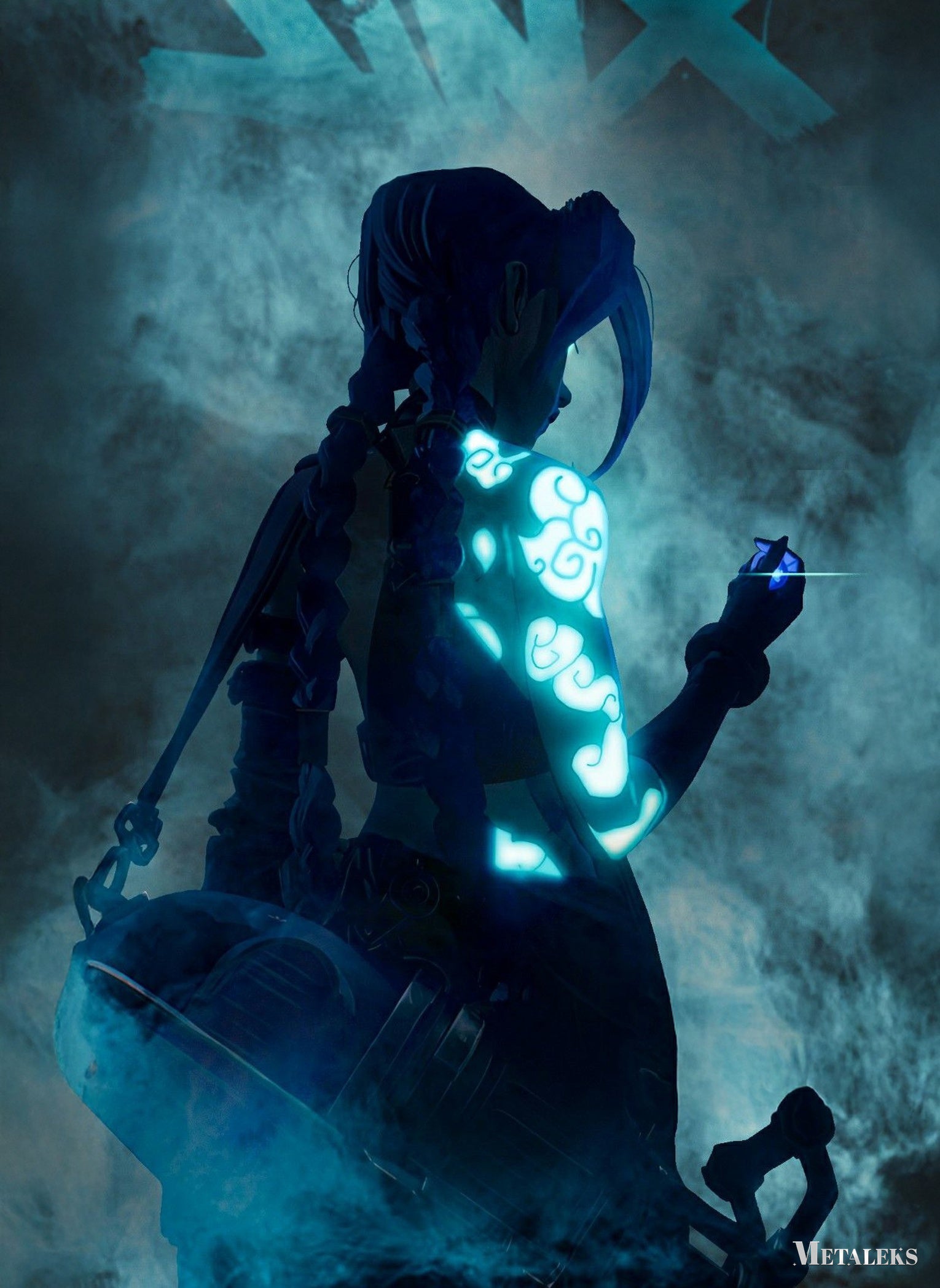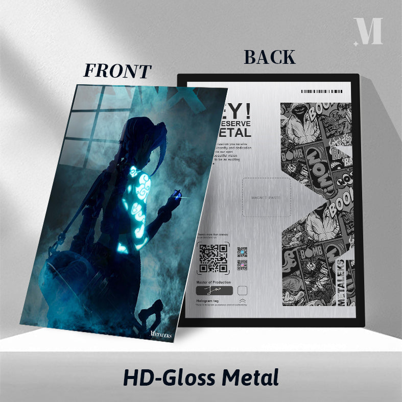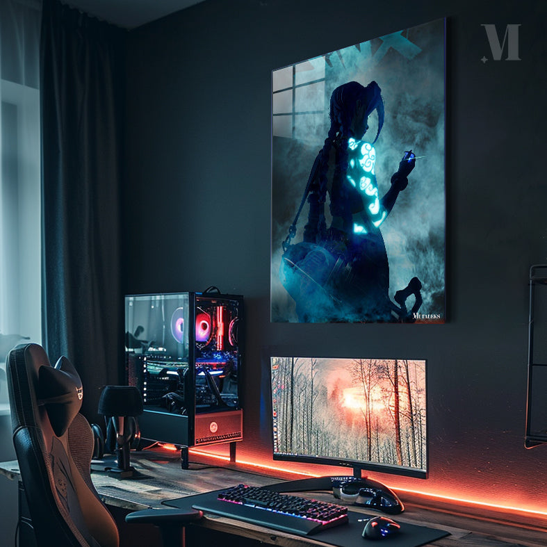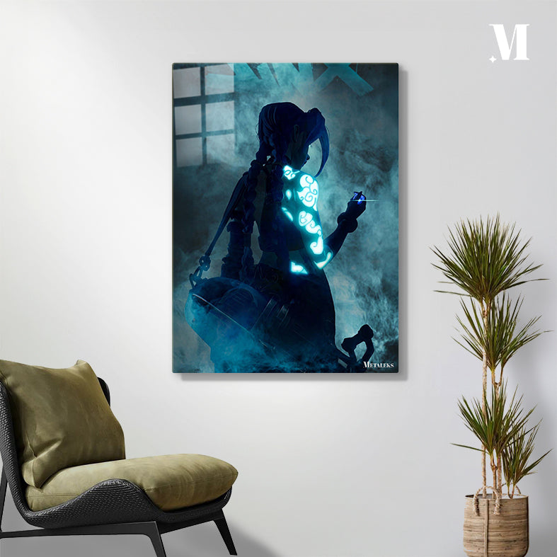 A character with braided hair, displaying glowing blue patterns on their arm, from the work “Arcane” (specifically Jinx). Metaleks Ultra HD Metal Poster – Create Your Passionate Space.