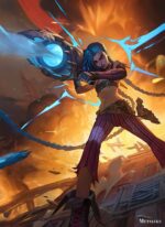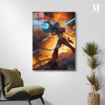Jinx from “League of Legends” is depicted holding a large weapon with flames and energy effects around her. Metaleks Ultra HD Metal Poster – Create Your Passionate Space.