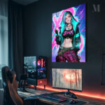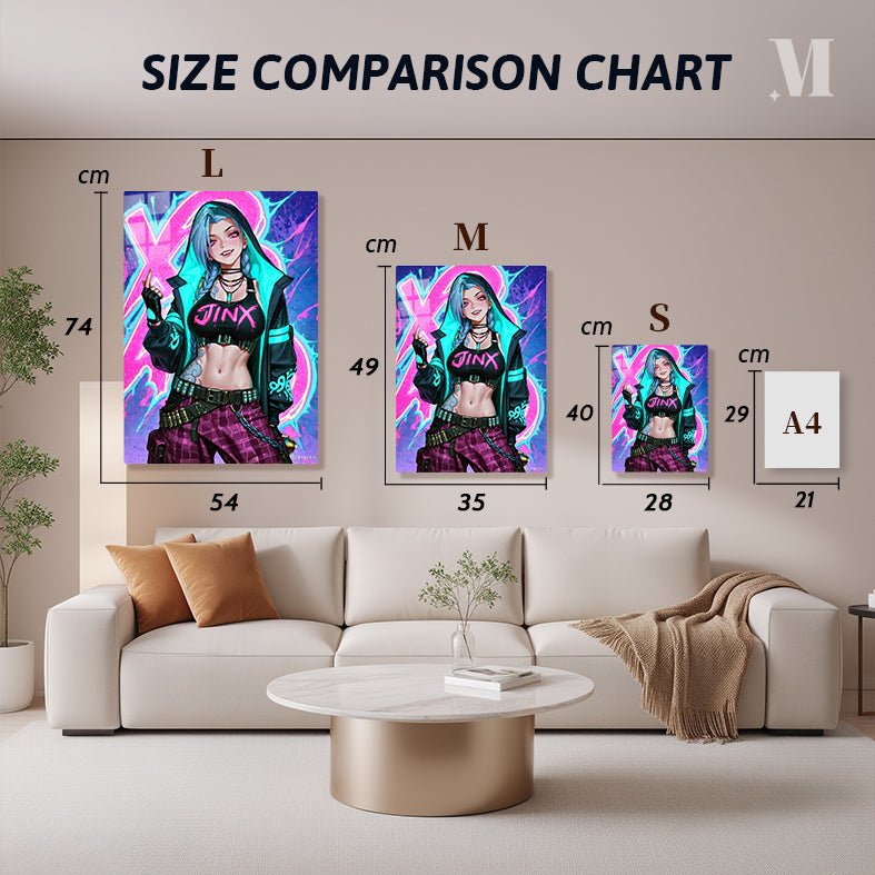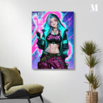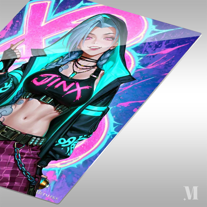 Jinx from the game *League of Legends*, wearing a black crop top with “JINX” in pink, a black and teal hoodie, and checkered pants with belts and chains, making a hand gesture. Metaleks Ultra HD Metal Poster – Create Your Passionate Space.
