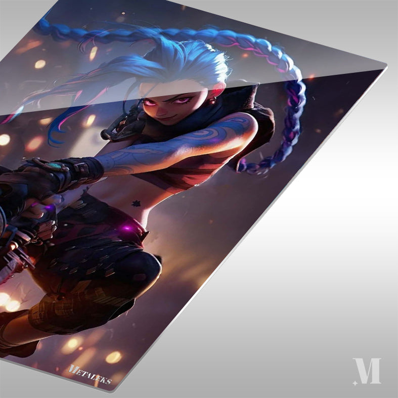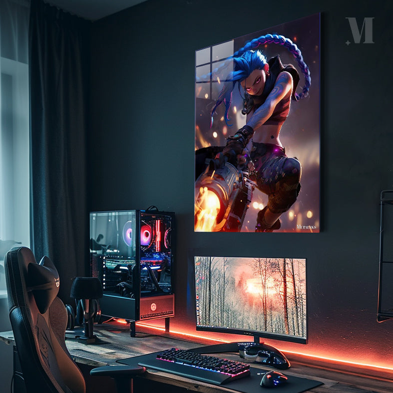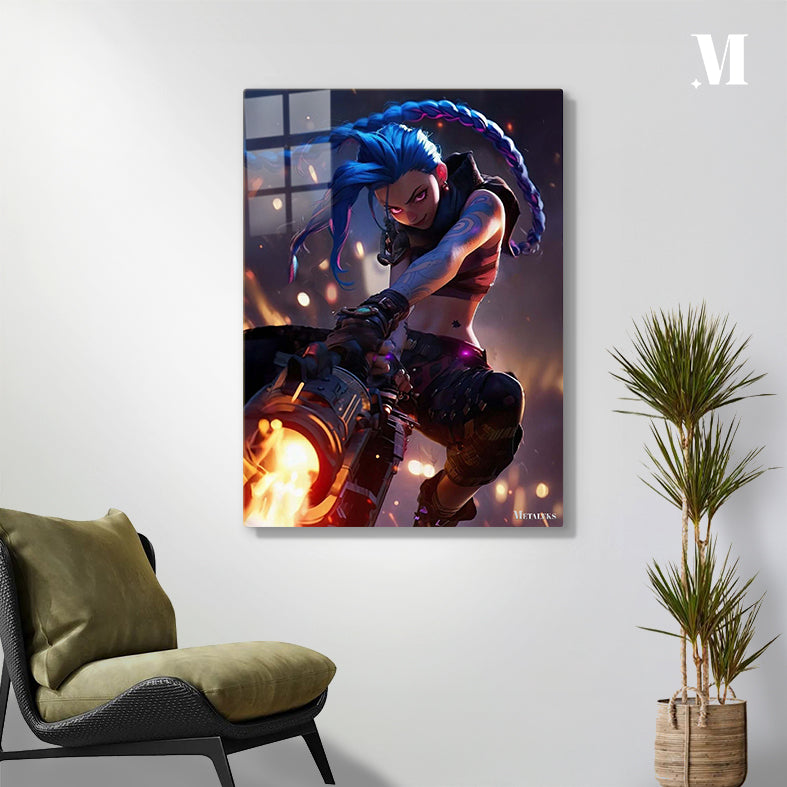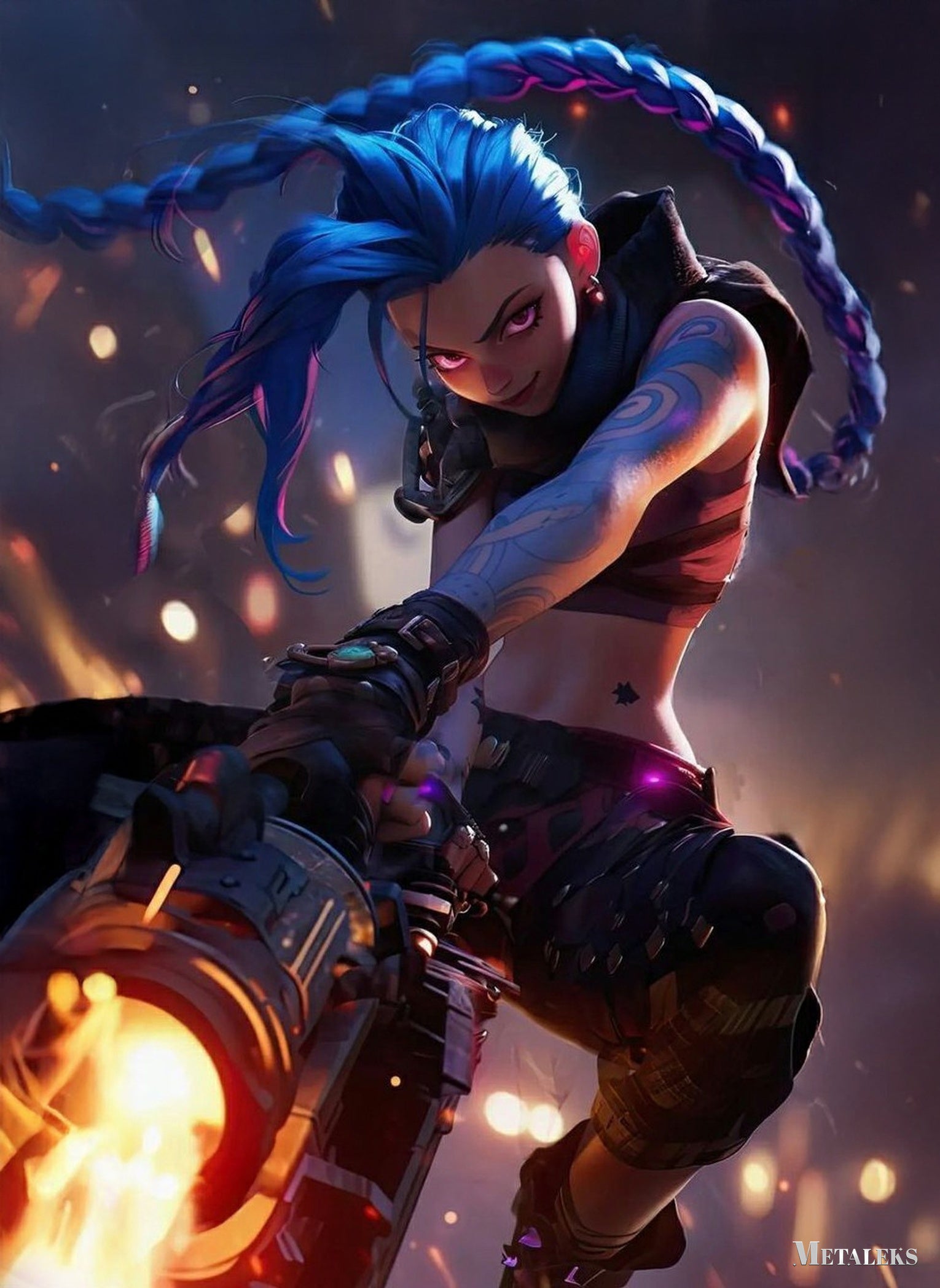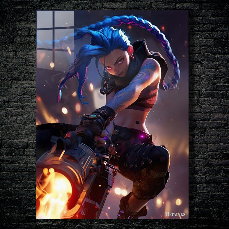 Jinx from “Arcane” is depicted holding a weapon that is emitting fire. Metaleks Ultra HD Metal Poster – Create Your Passionate Space.