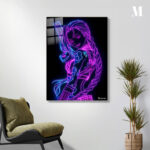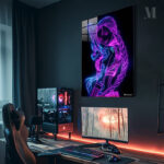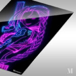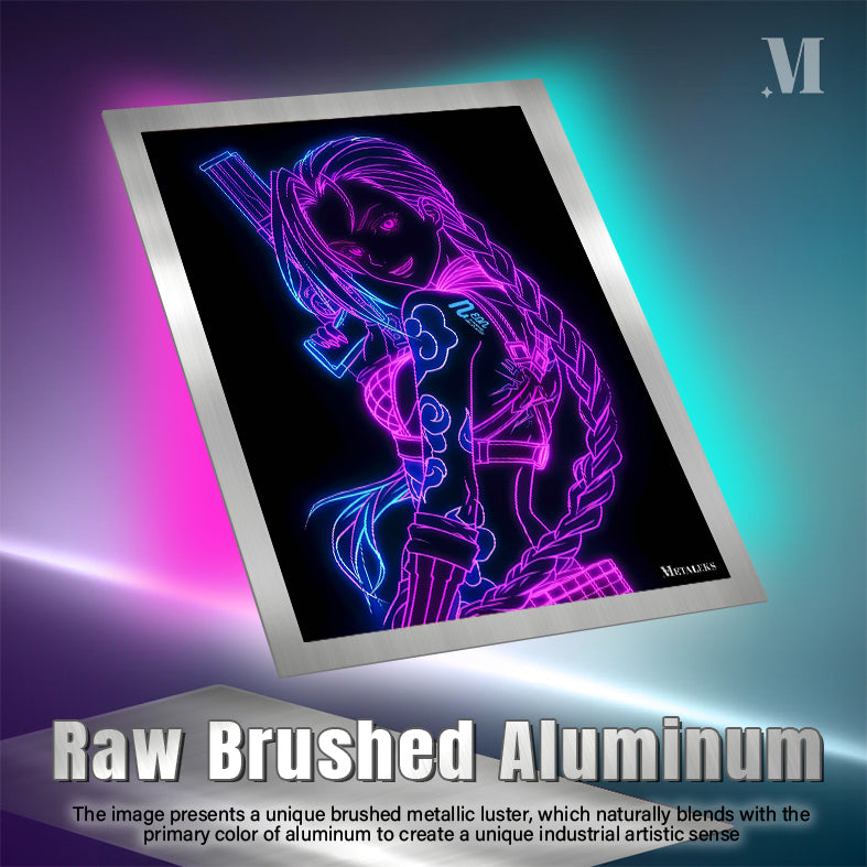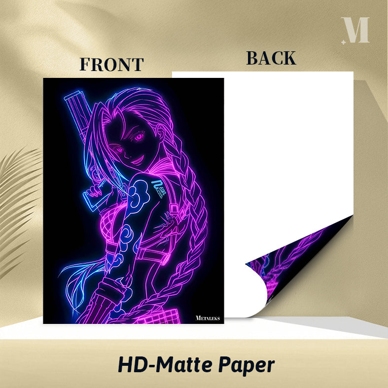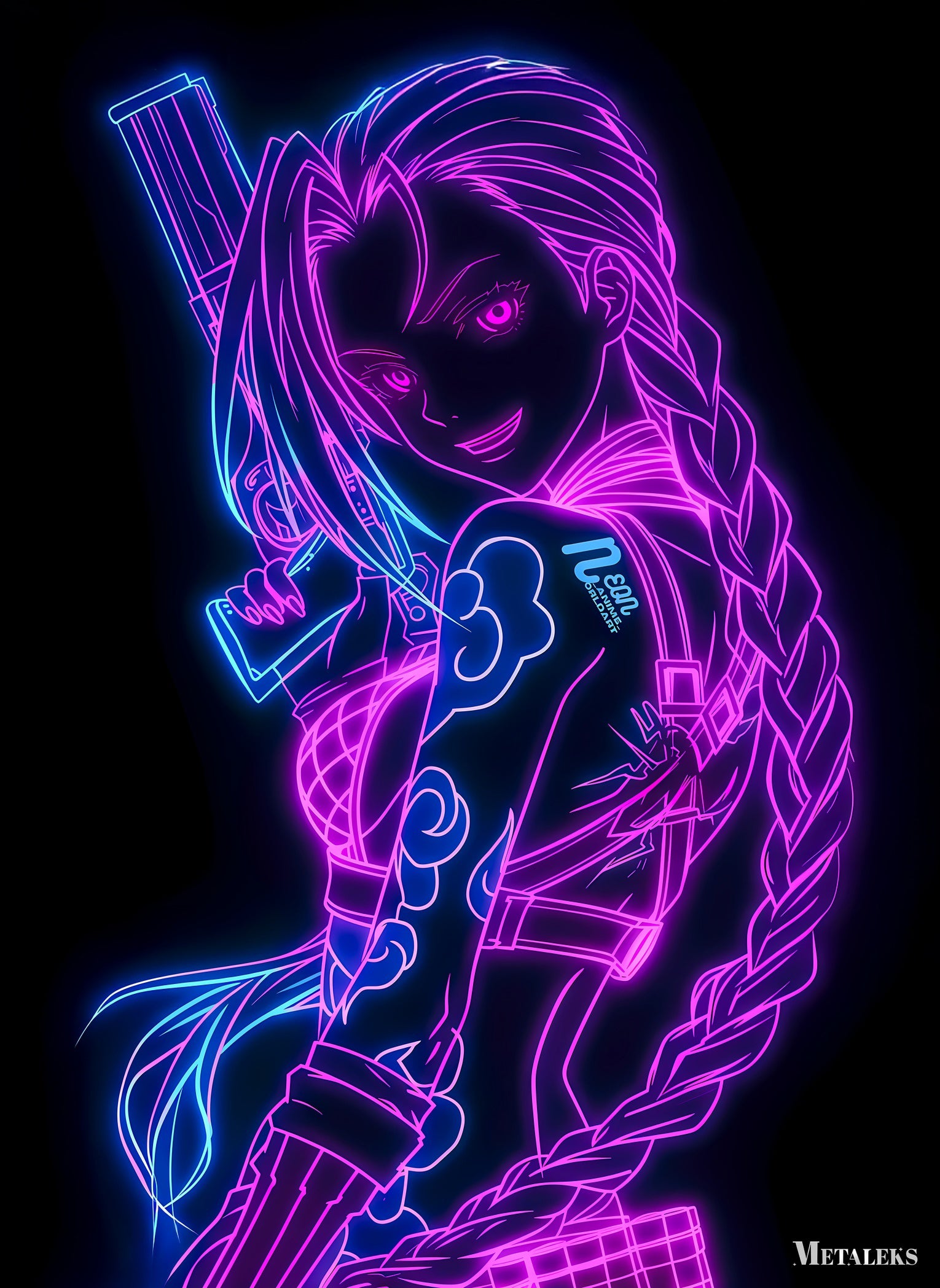 A neon-lit illustration of Jinx from “League of Legends,” featuring vibrant pink and blue outlines, a braid, and holding a weapon. Metaleks Ultra HD Metal Poster – Create Your Passionate Space.