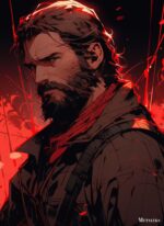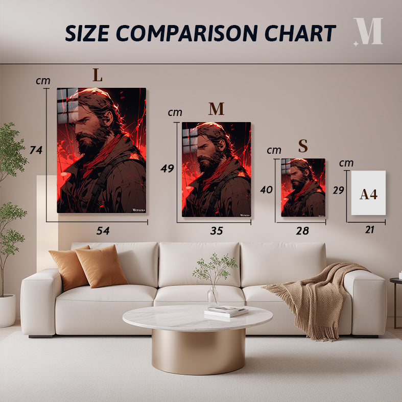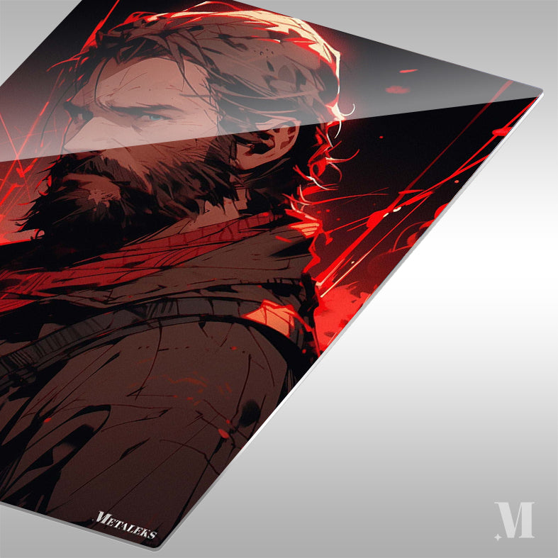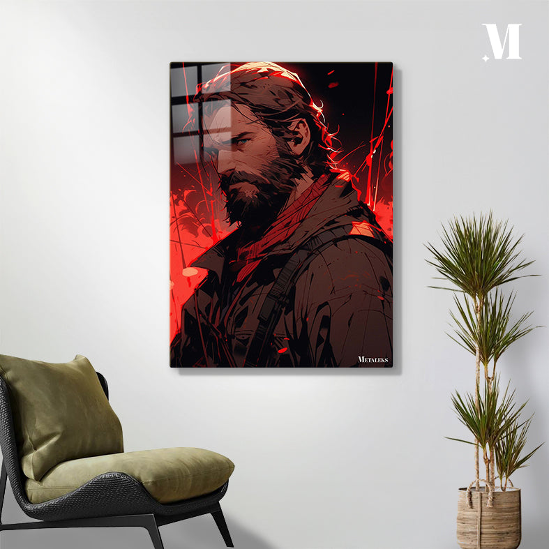 Joel from The Last of Us has long hair and a beard, wearing a dark jacket and a red scarf. Metaleks Ultra HD Metal Poster – Create Your Passionate Space.