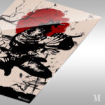 Guts from Berserk is depicted in a dynamic pose, showcasing his muscular build and intense expression. He is wearing his signature armor and holding a large sword, ready for battle. The background features a red sun, adding to the dramatic atmosphere. Metaleks Ultra HD Metal Poster – Create Your Passionate Space.