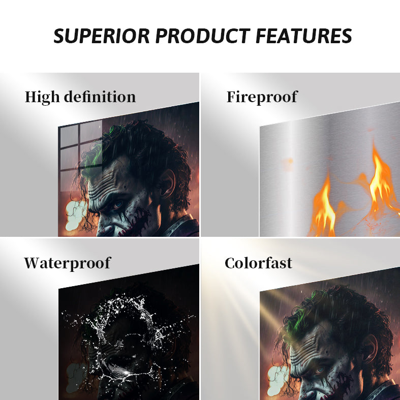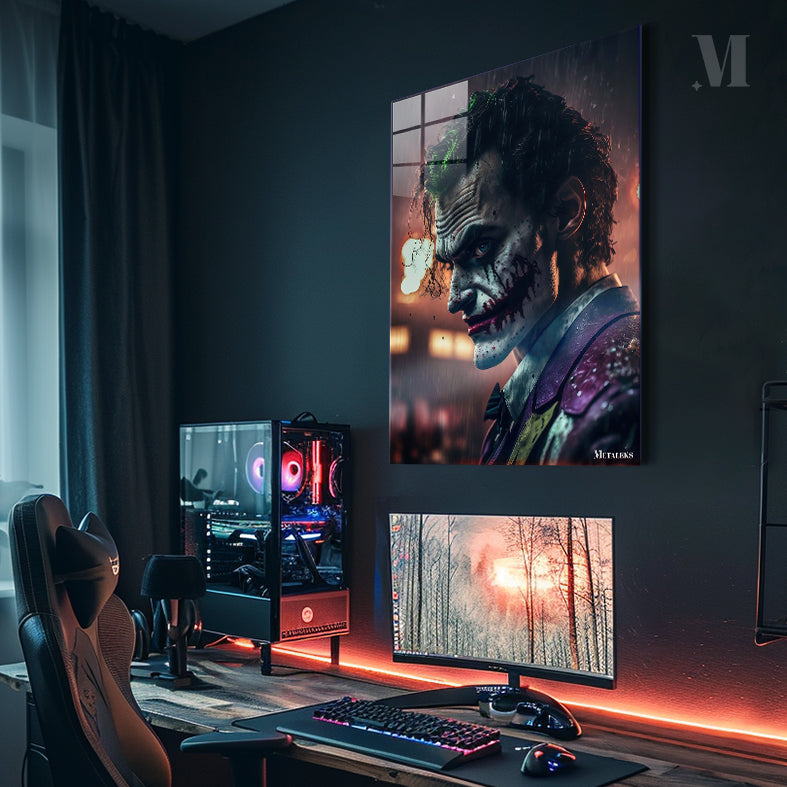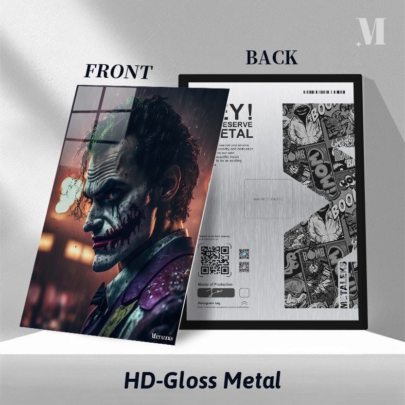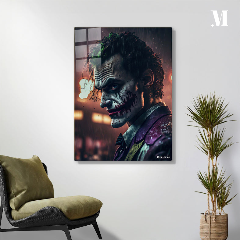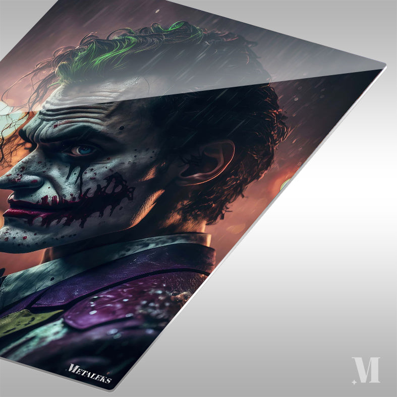 The Joker from “The Dark Knight” has green hair, a white face with black and red markings, and is wearing a purple jacket. Metaleks Ultra HD Metal Poster – Create Your Passionate Space.