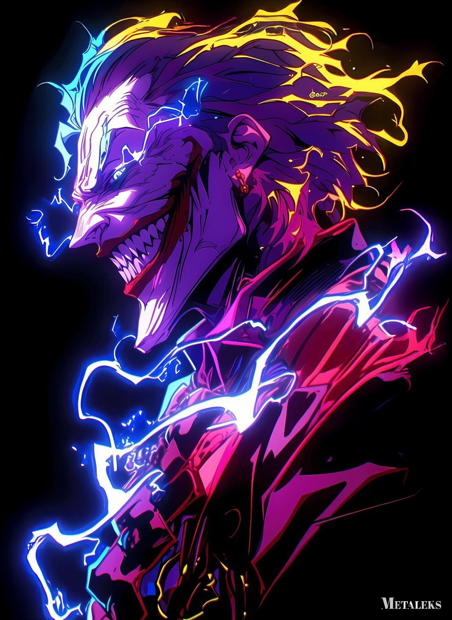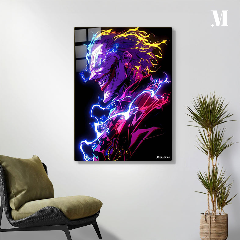 The Joker is depicted in a stylized, neon-lit illustration. His face is contorted into a menacing grin, revealing sharp teeth. Lightning-like effects emanate from his head and body, with a color palette of purple, blue, yellow, and red.
