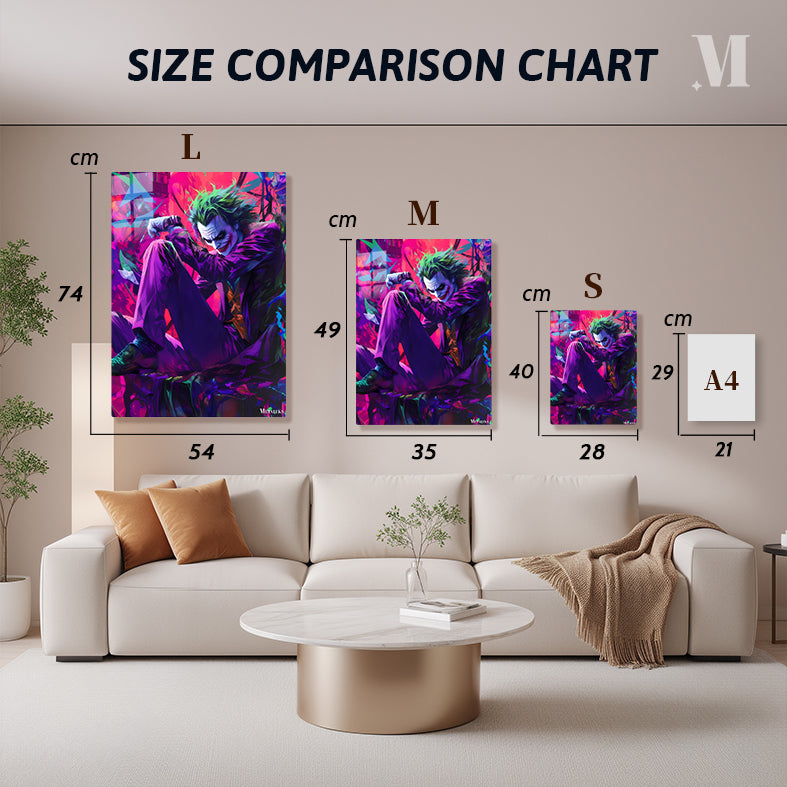 The Joker from the Batman series is depicted with green hair, a purple suit, and a white face with exaggerated makeup. He is sitting with his legs bent and his arm resting on his knee, displaying a mischievous grin. Metaleks Ultra HD Metal Poster – Create Your Passionate Space.