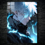 Gojo Satoru from Jujutsu Kaisen has spiky white hair and wears round glasses. He has glowing blue eyes and blue lightning-like effects around him. Metaleks Ultra HD Metal Poster – Create Your Passionate Space.