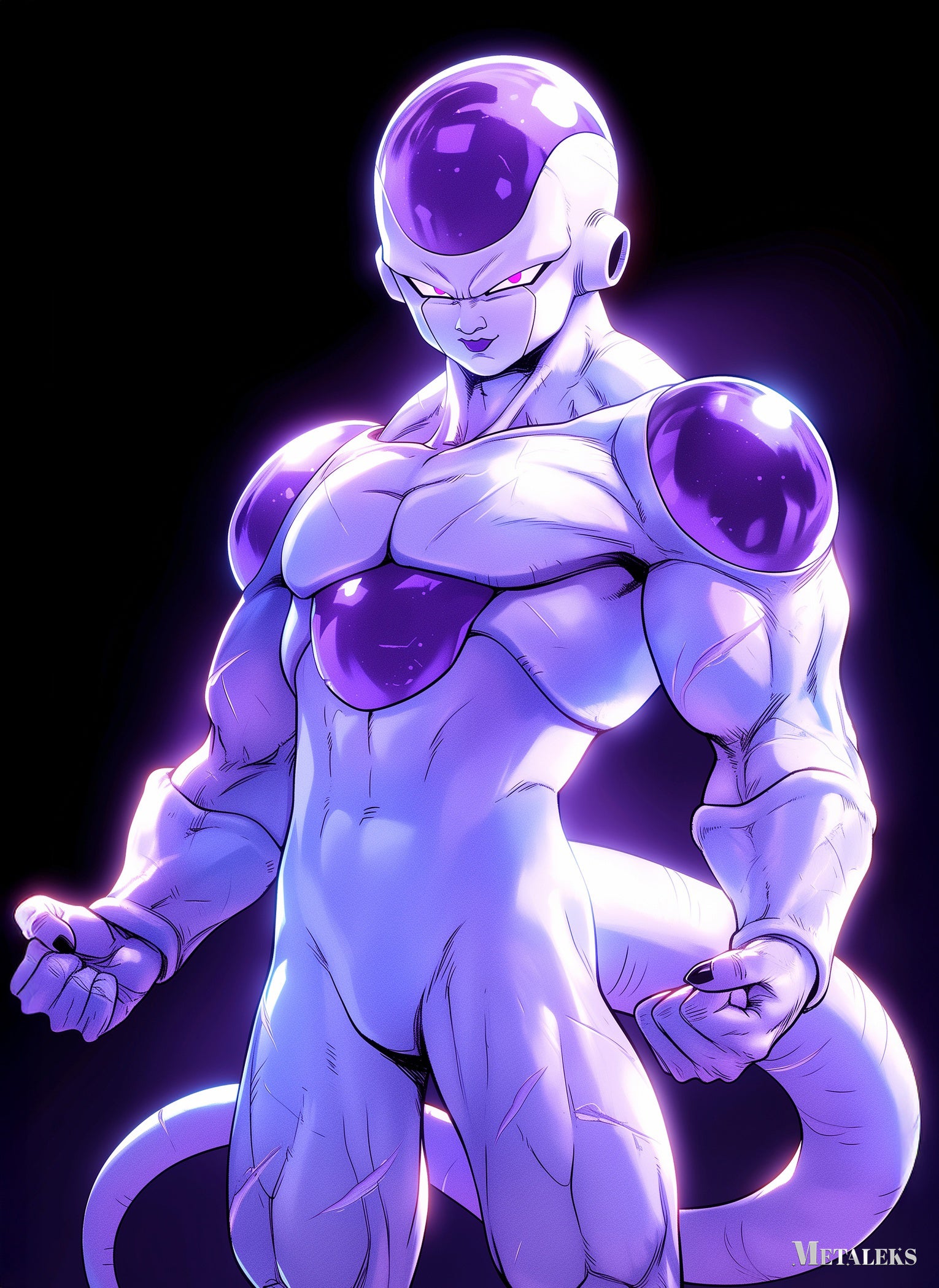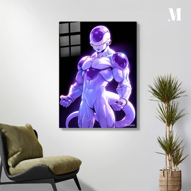 Frieza from the Dragon Ball series, characterized by his purple and white armored appearance with a muscular build and a tail. Metaleks Ultra HD Metal Poster – Create Your Passionate Space.