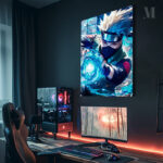Kakashi from “Naruto” is depicted with spiky white hair, wearing a headband and mask. He is using a blue energy sphere with his right hand. Metaleks Ultra HD Metal Poster – Create Your Passionate Space.