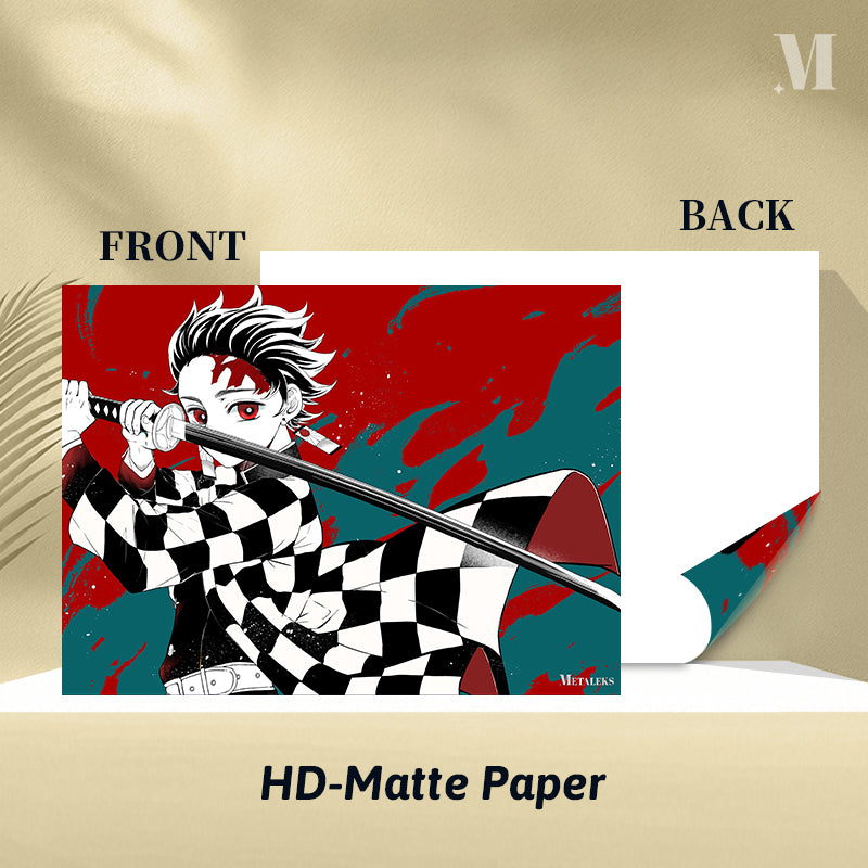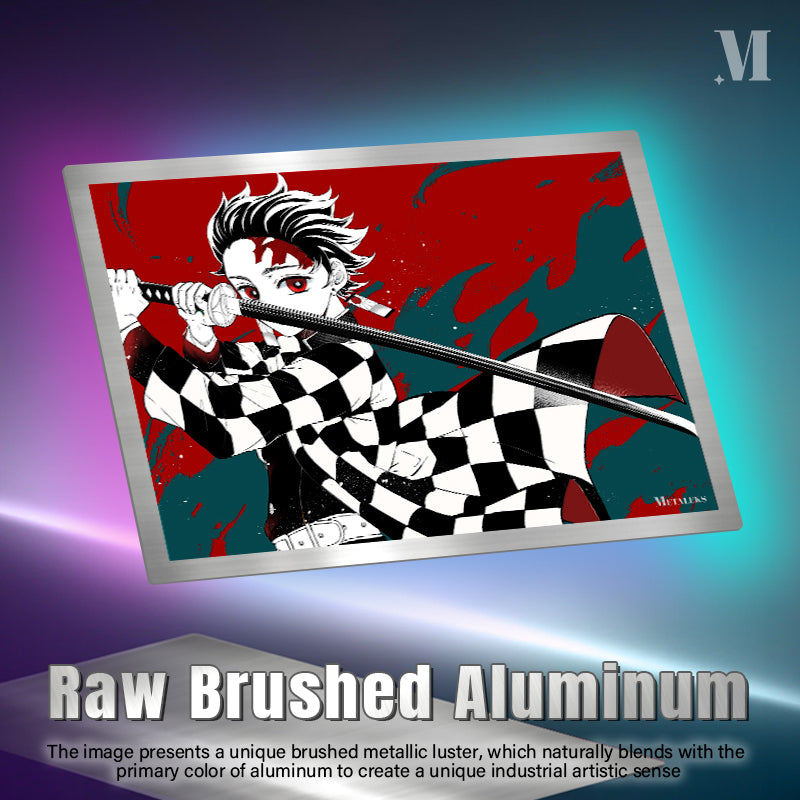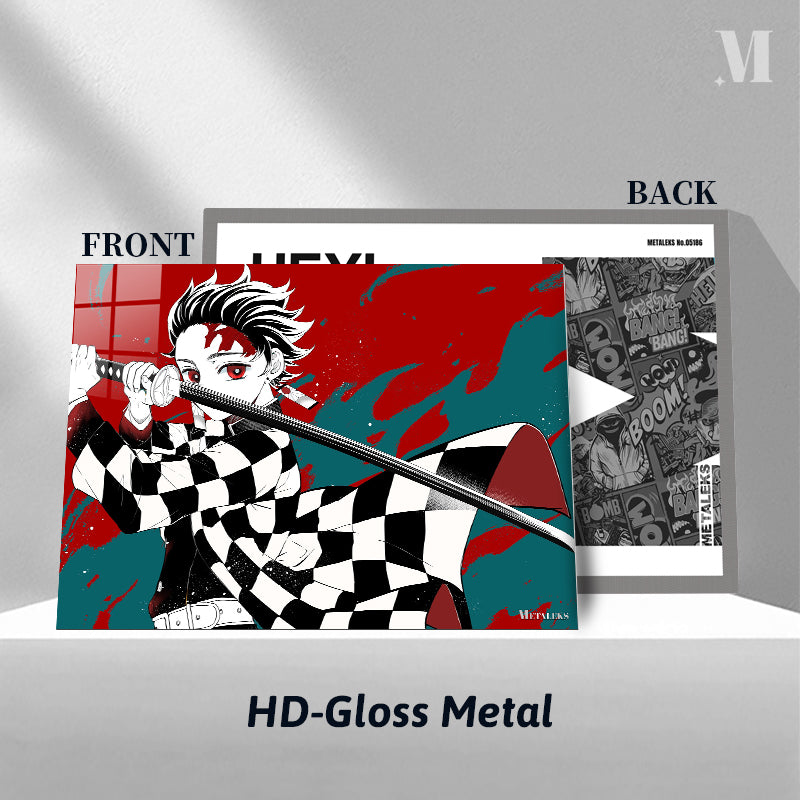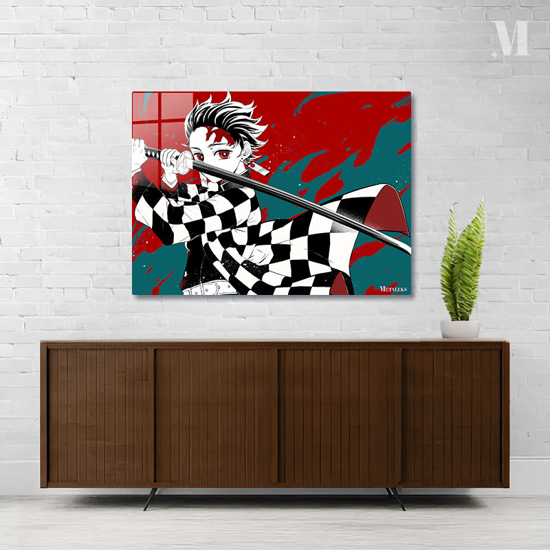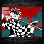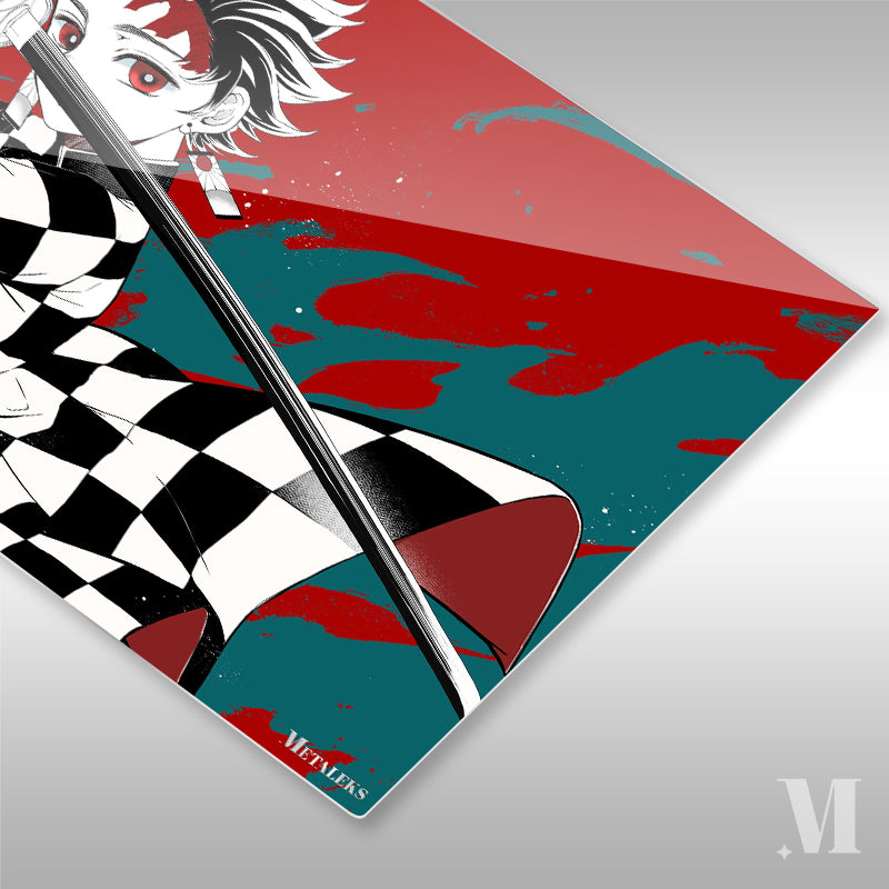 Tanjiro Kamado from “Demon Slayer” holds a sword in a ready stance. Metaleks Ultra HD Metal Poster – Create Your Passionate Space.