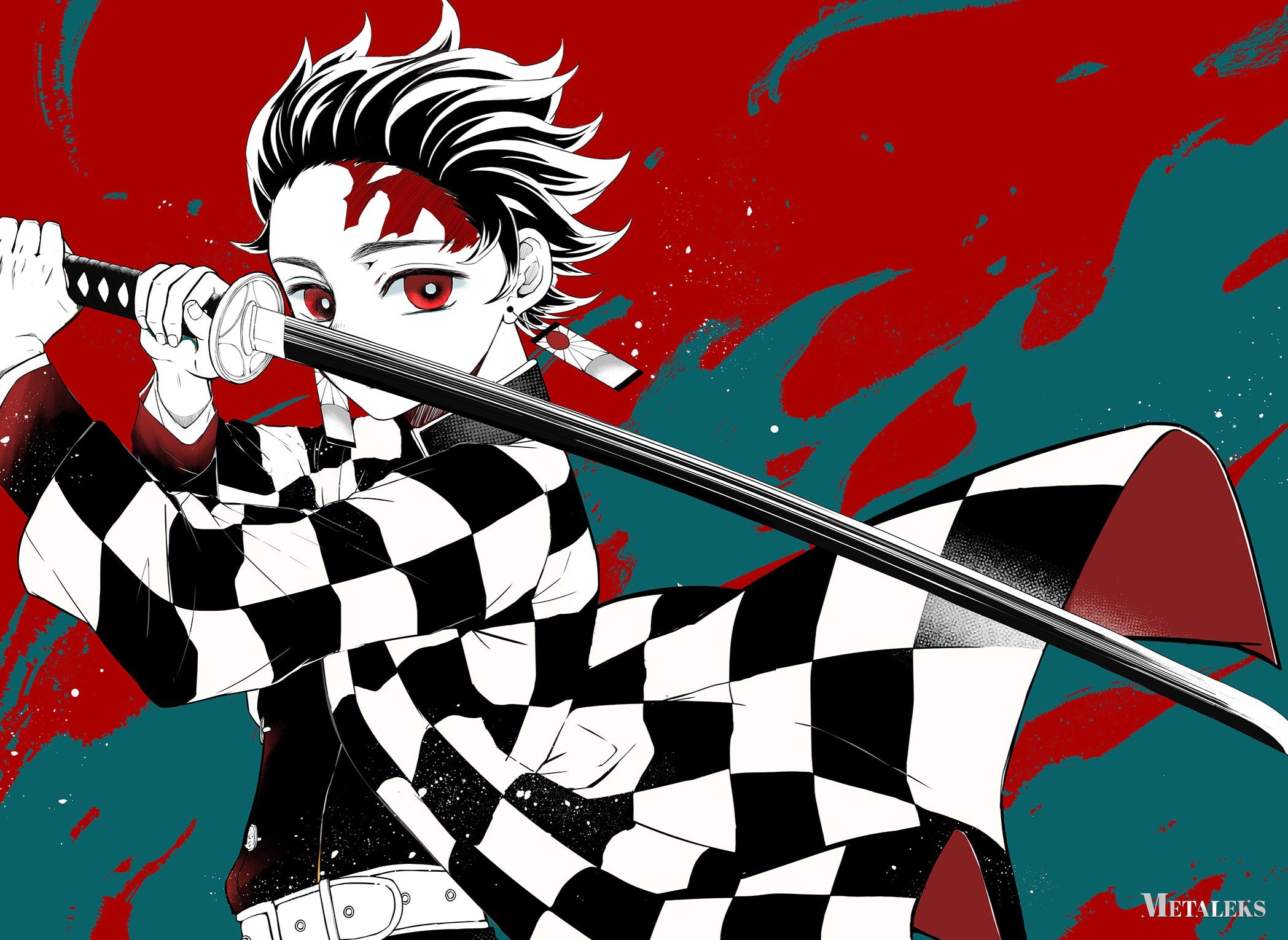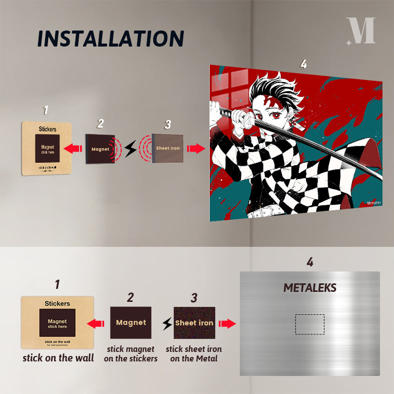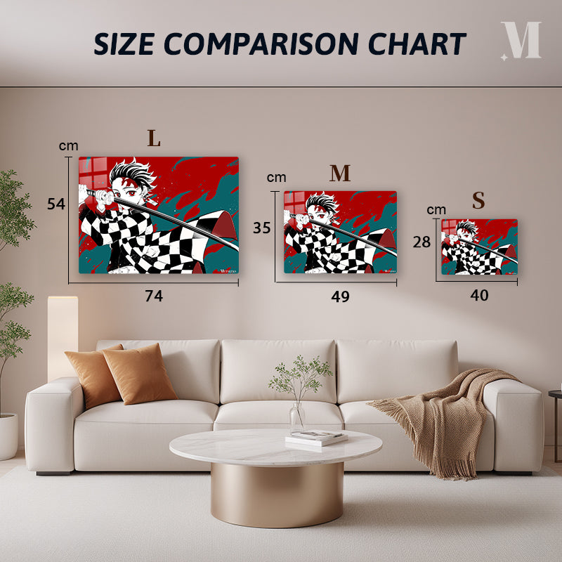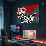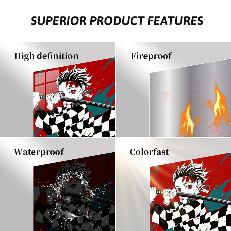 Tanjiro Kamado from “Demon Slayer” holds a sword in a ready stance. Metaleks Ultra HD Metal Poster – Create Your Passionate Space.