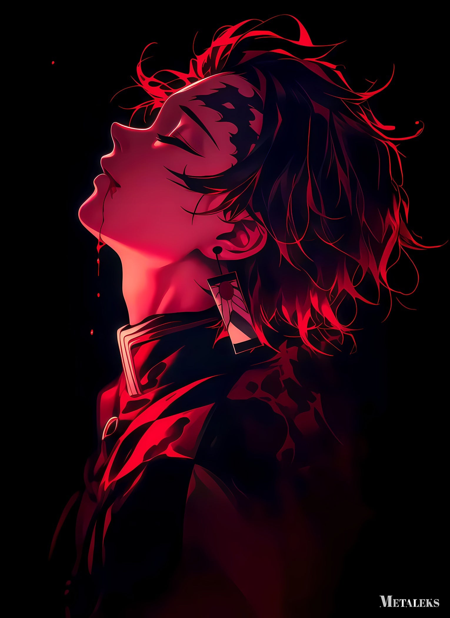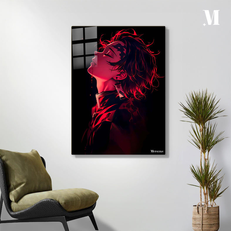 Tanjiro Kamado from Demon Slayer is depicted in a dramatic, artistic style with a red color scheme. His head is tilted back, eyes closed, and blood drips from his mouth. He has a mark on his forehead and wears a hanafuda earring.