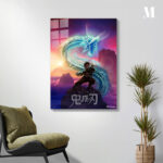 Tanjiro Kamado from Demon Slayer: Kimetsu no Yaiba stands on a rocky peak, wielding a sword with a dragon made of water swirling behind him. Metaleks Ultra HD Metal Poster – Create Your Passionate Space.
