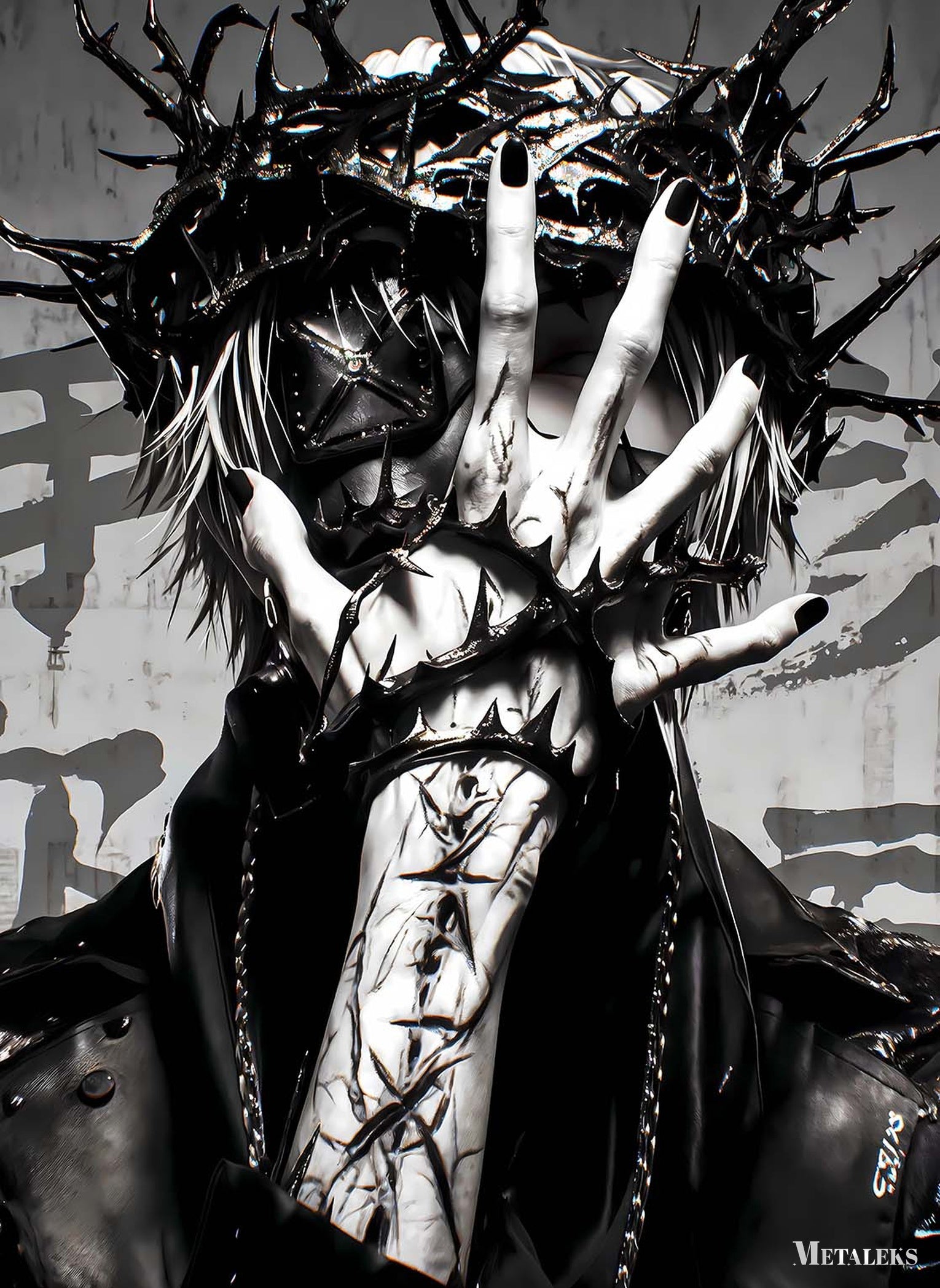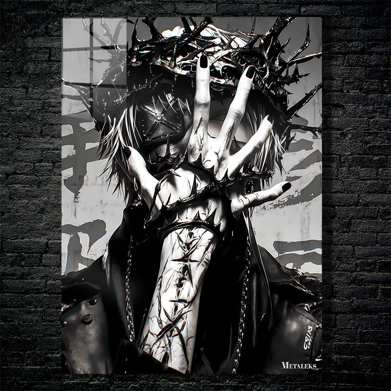 A person wearing a crown of thorns and a leather jacket, with their hand wrapped in barbed wire. Metaleks Ultra HD Metal Poster – Create Your Passionate Space.