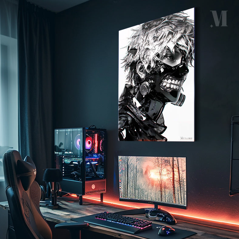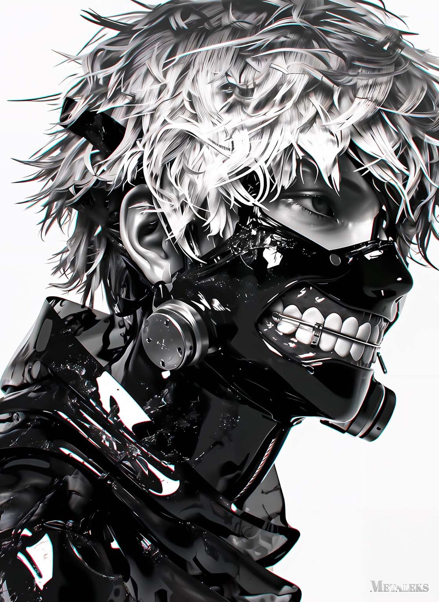 A person with spiky, white hair and a black, mechanical mask covering the lower part of their face. Metaleks Ultra HD Metal Poster – Create Your Passionate Space.