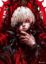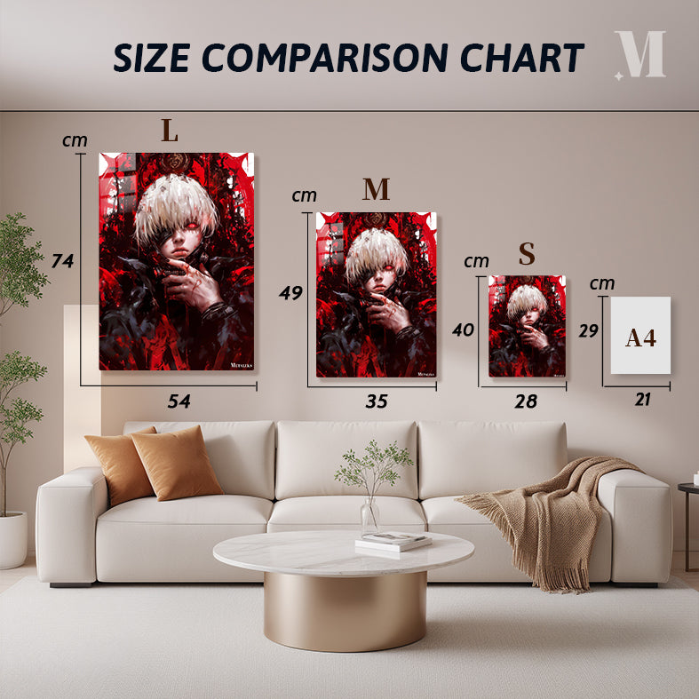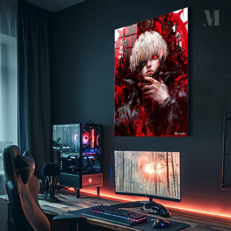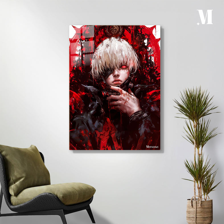 Ken Kaneki from Tokyo Ghoul is depicted with short white hair. His left eye is covered by a black patch, and his right eye glows red. He wears a dark outfit with red accents and holds his hand near his mouth, which has blood on it. Metaleks Ultra HD Metal Poster – Create Your Passionate Space.