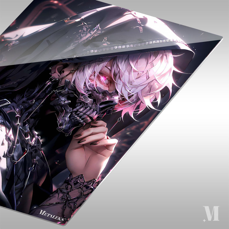 A person with white hair and a black hooded outfit, featuring a skeletal mask with glowing pink eyes. Metaleks Ultra HD Metal Poster – Create Your Passionate Space.