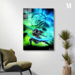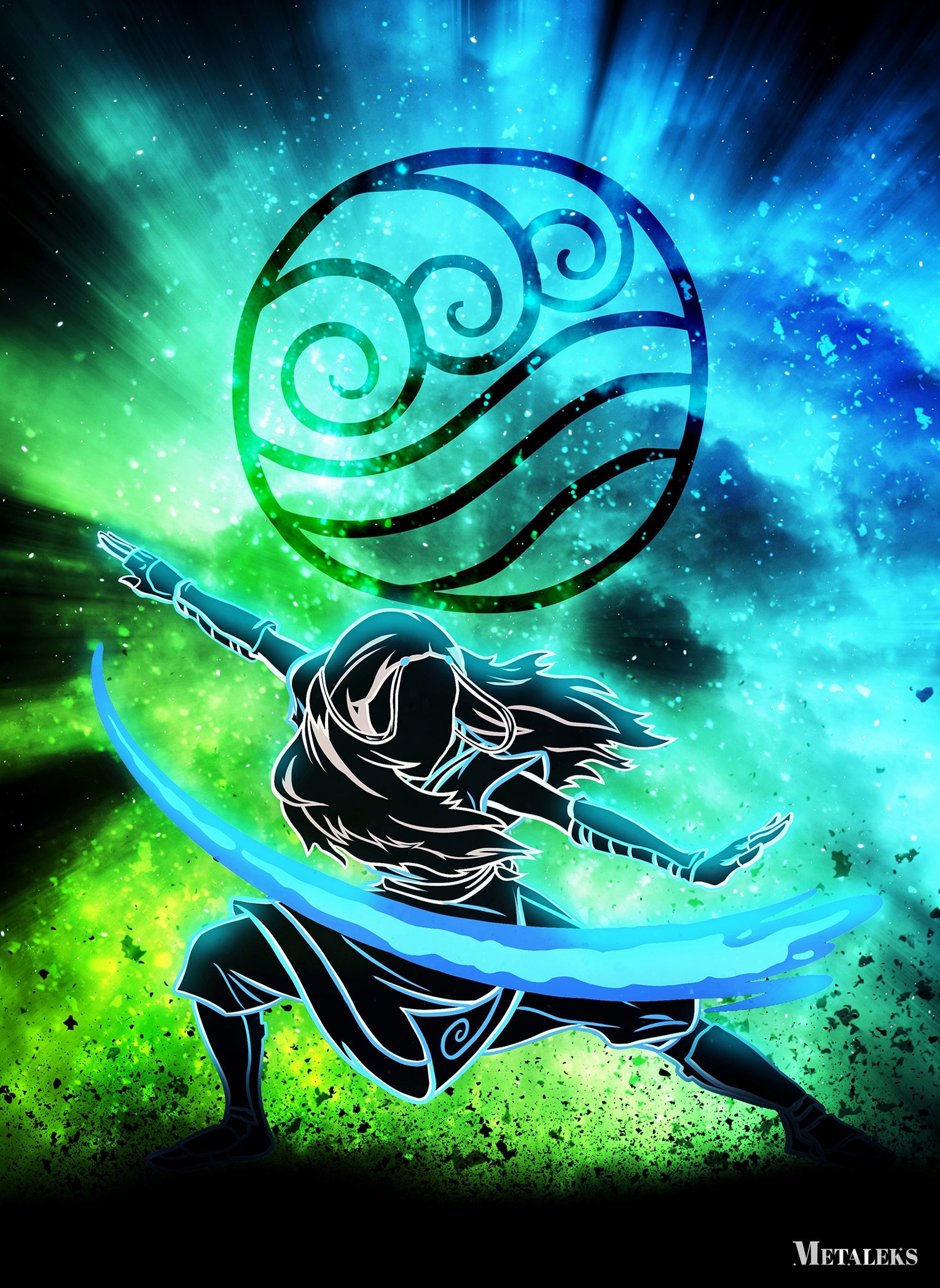 A person with long hair, wearing a dark outfit, is performing a martial arts stance. They have one arm extended forward and the other arm extended backward. A blue energy wave is emanating from their hands. Above them is a circular symbol with swirling patterns. Metaleks Ultra HD Metal Poster – Create Your Passionate Space.