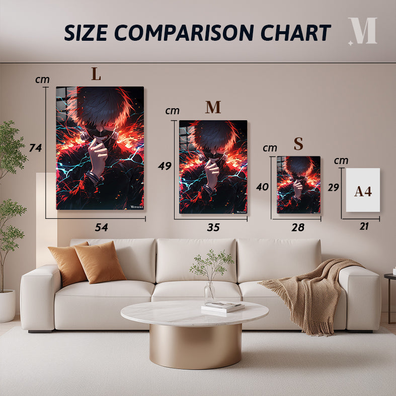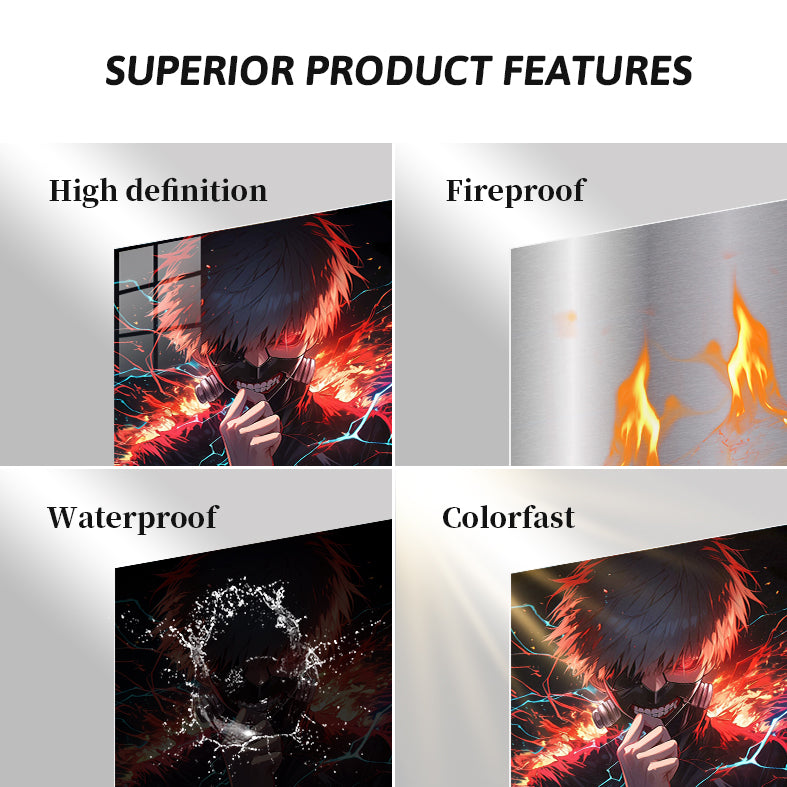 Tomura Shigaraki from My Hero Academia has red eyes, is wearing a black mask, and is surrounded by flames and blue lightning. Metaleks Ultra HD Metal Poster – Create Your Passionate Space.