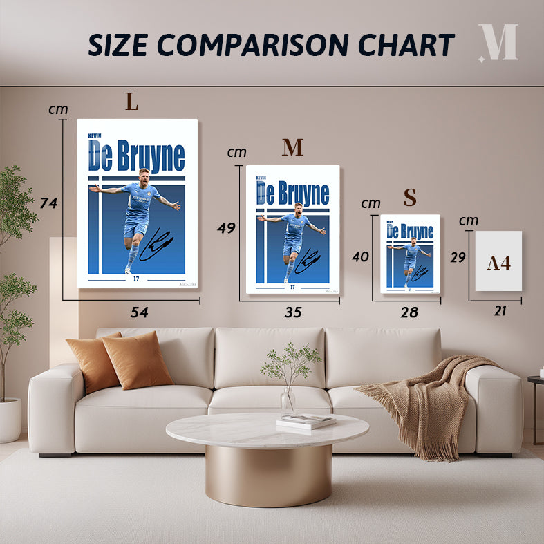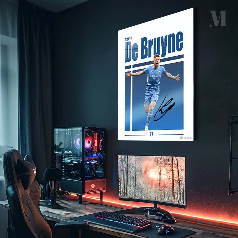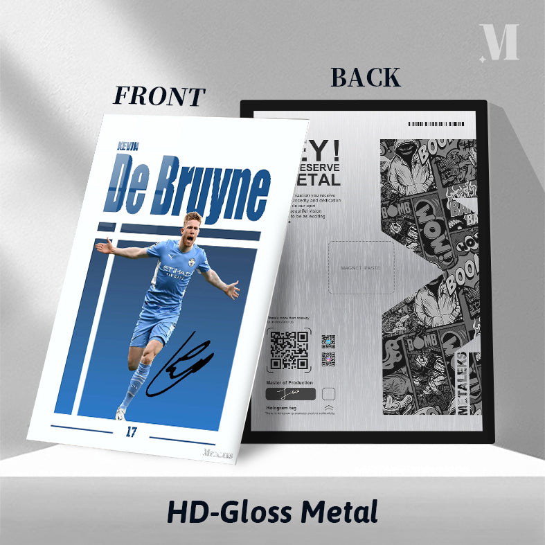 Kevin De Bruyne, a professional soccer player, is depicted in a blue Manchester City uniform. He is celebrating with his arms outstretched. Metaleks Ultra HD Metal Poster – Create Your Passionate Space.