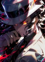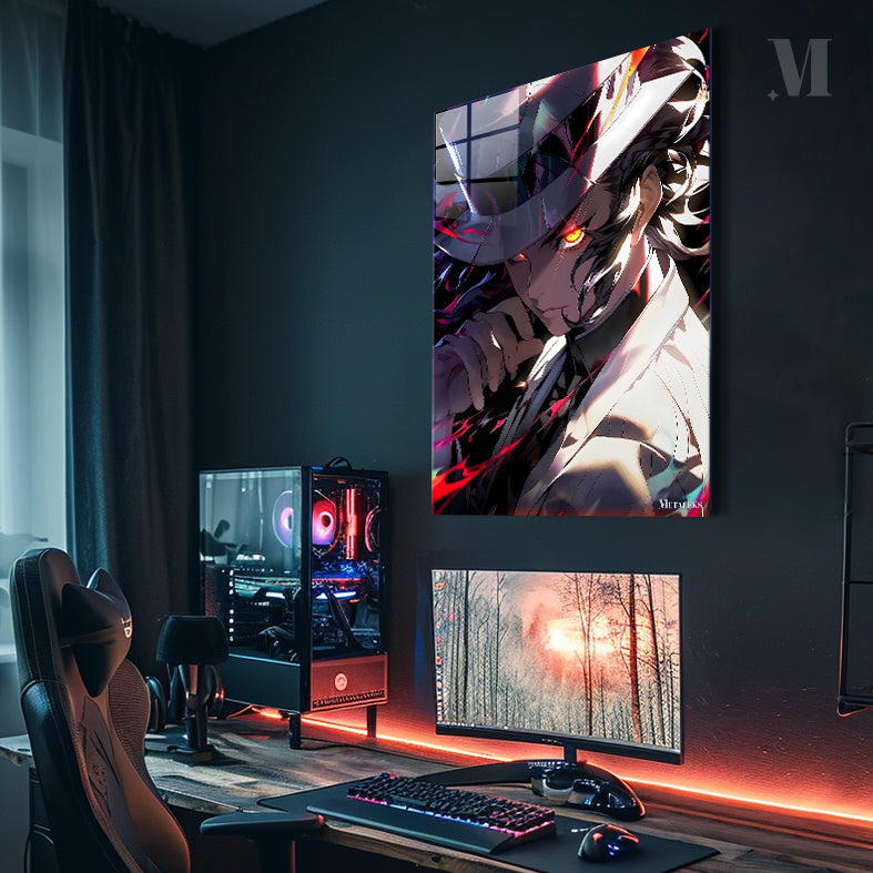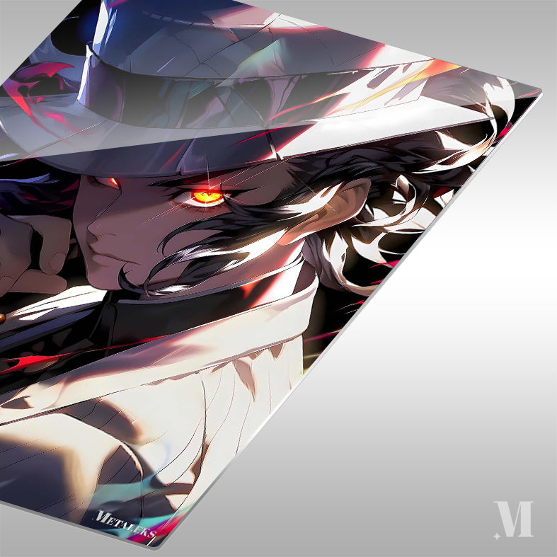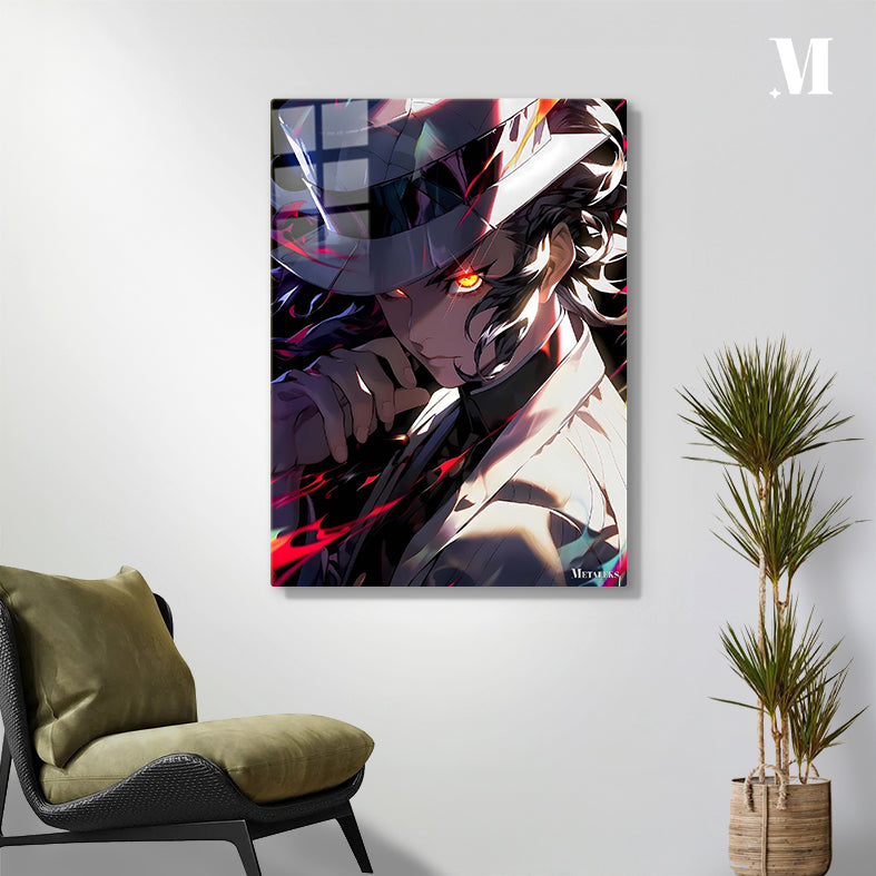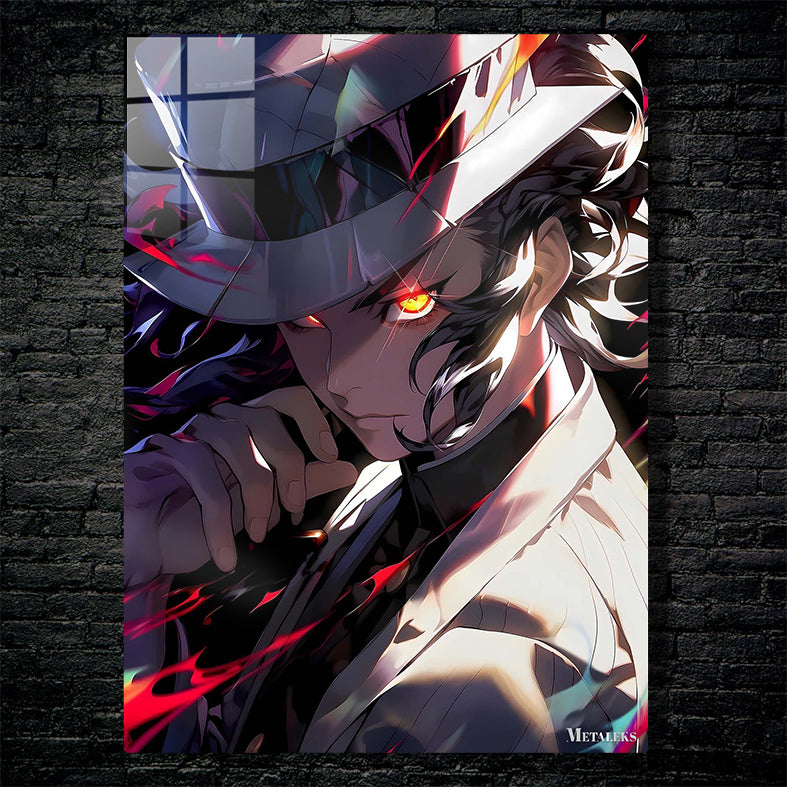 Dio Brando from JoJo’s Bizarre Adventure, wearing a top hat and a white suit, with fiery red eyes and dark hair. Metaleks Ultra HD Metal Poster – Create Your Passionate Space.