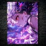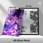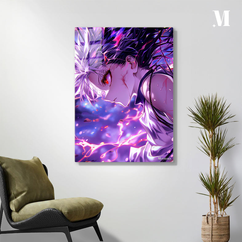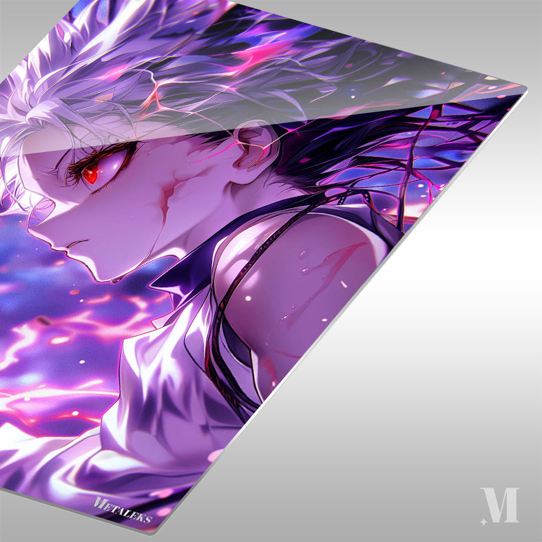 Gojo Satoru from “Jujutsu Kaisen” has white hair, a red eye, and is surrounded by glowing energy. Metaleks Ultra HD Metal Poster – Create Your Passionate Space.