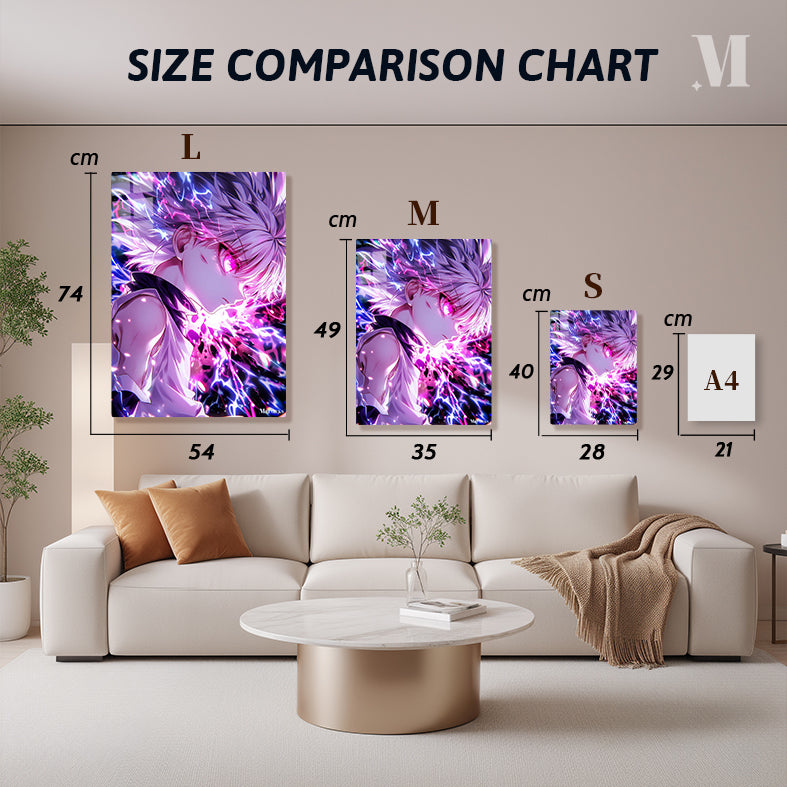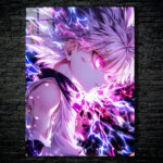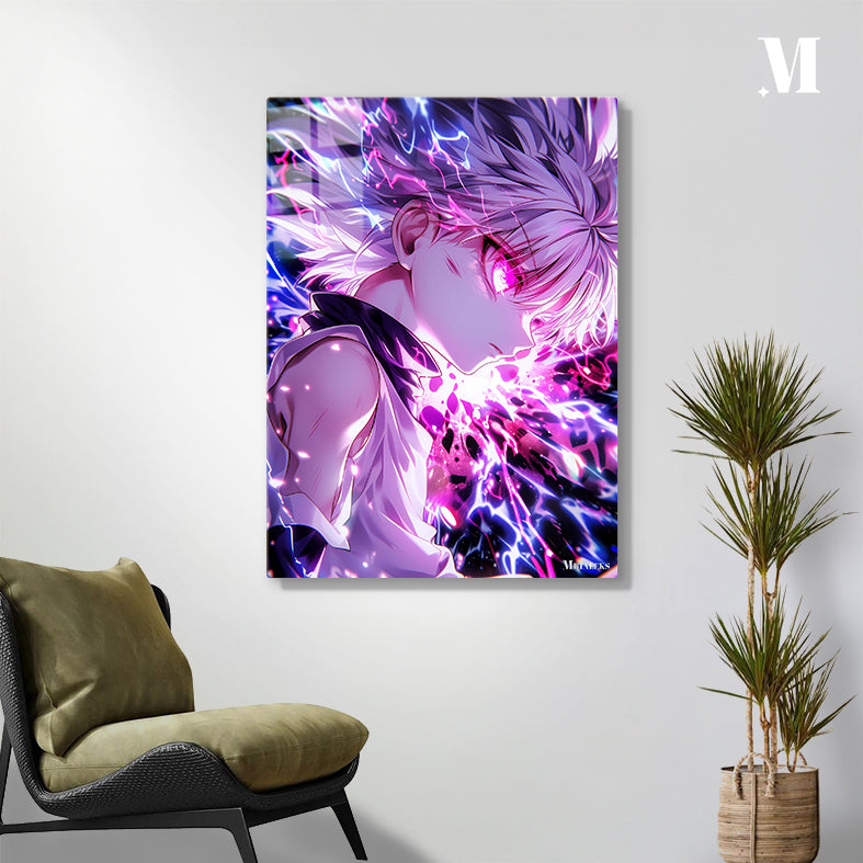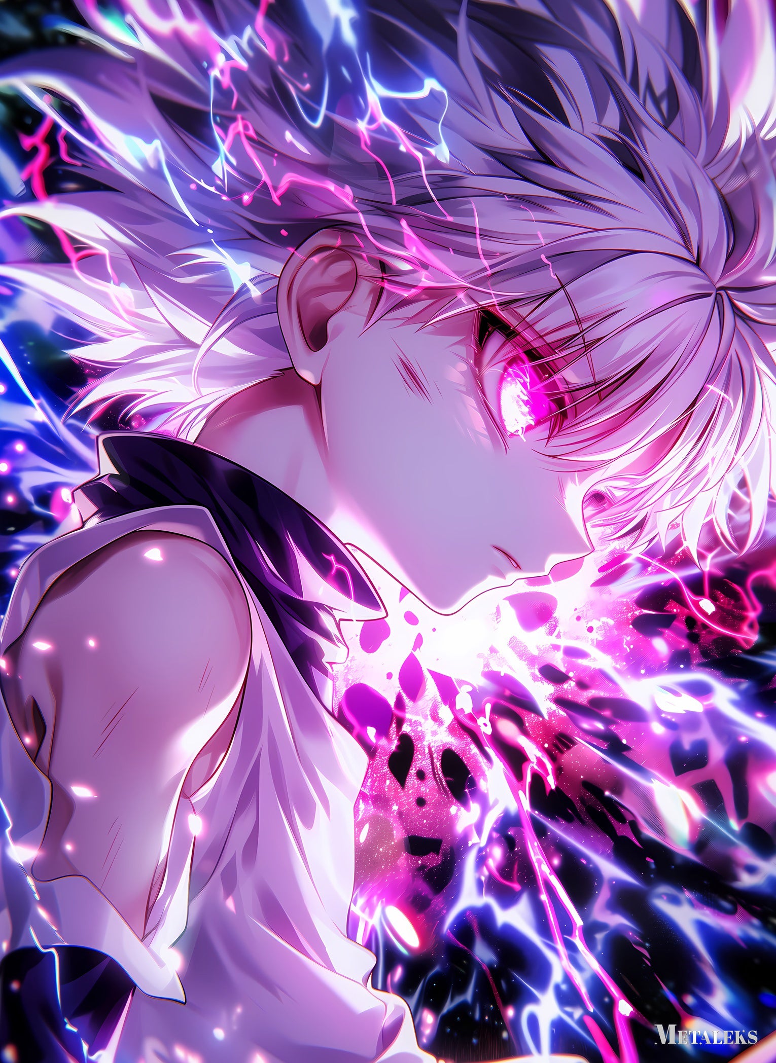 Gon Freecss from Hunter x Hunter has spiky white hair and glowing pink eyes. He is surrounded by electric-like energy. Metaleks Ultra HD Metal Poster – Create Your Passionate Space.