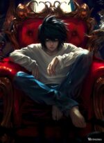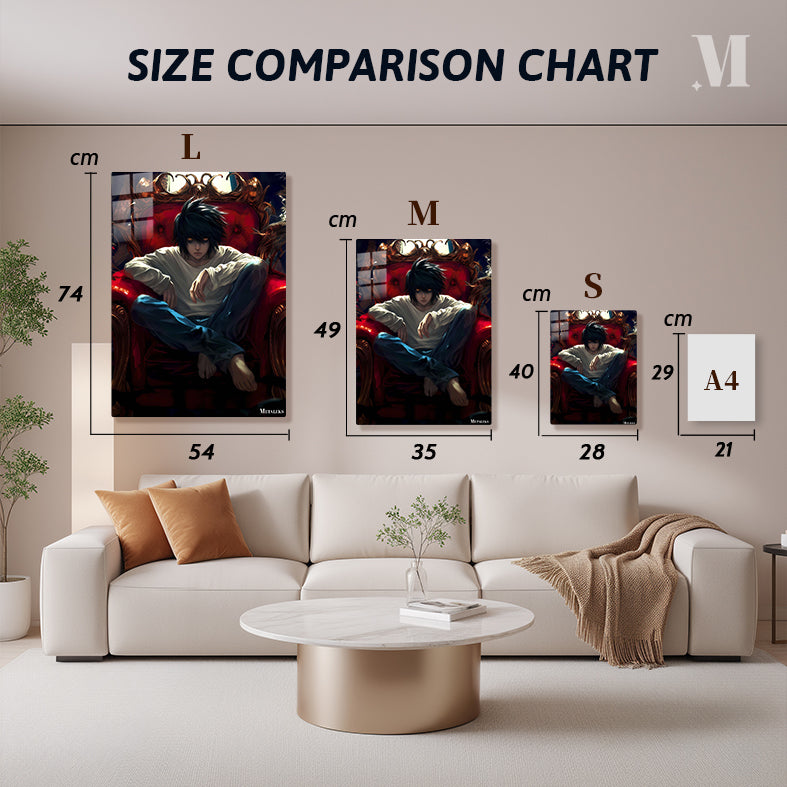 Light Yagami from Death Note is sitting on a red chair with ornate golden details. He has black hair and is wearing a white long-sleeve shirt and blue pants. His legs are crossed, and he has a relaxed posture. Metaleks Ultra HD Metal Poster – Create Your Passionate Space.