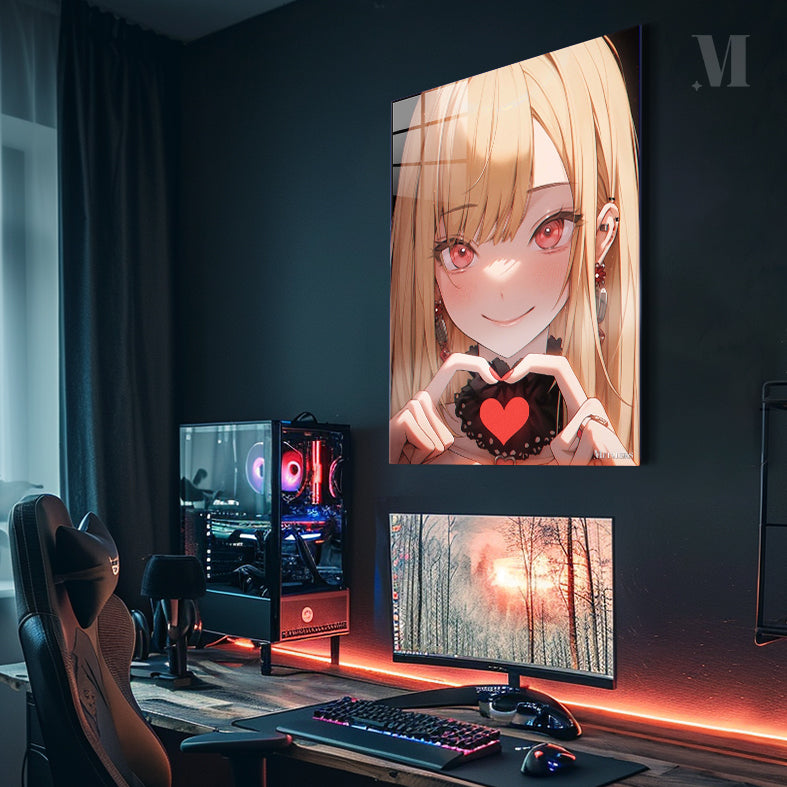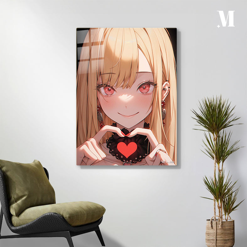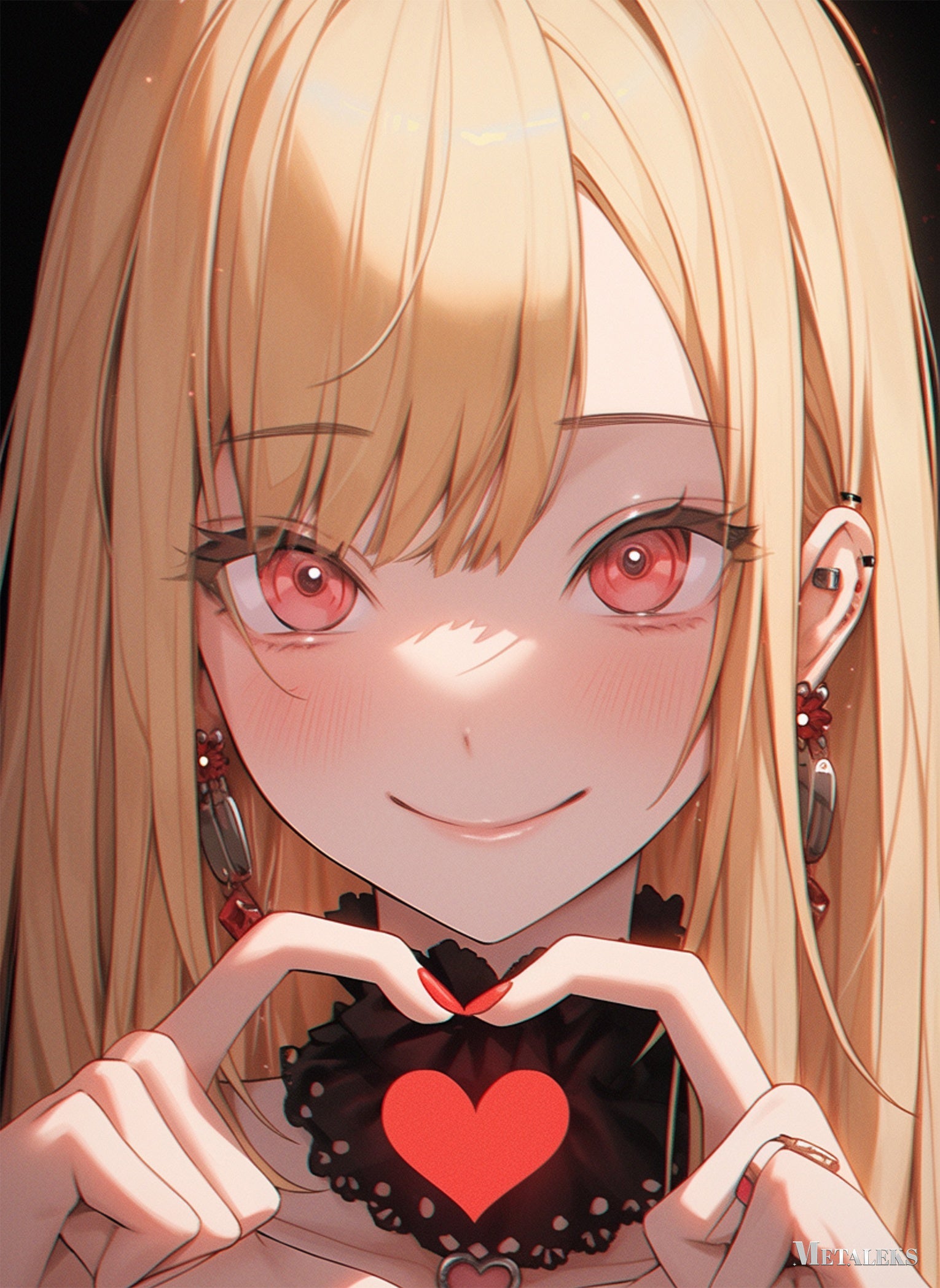 A girl with long blonde hair, red eyes, and red nail polish is making a heart shape with her hands. She is wearing a black choker with a red heart on it and earrings with red accents. Metaleks Ultra HD Metal Poster – Create Your Passionate Space.
