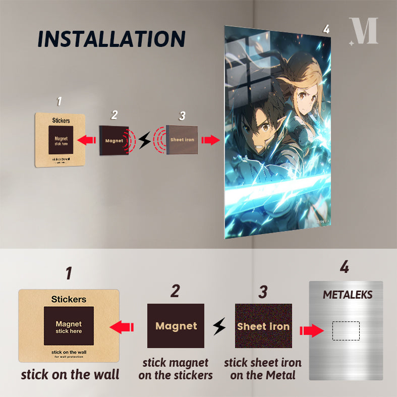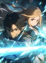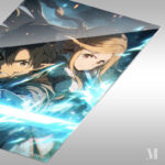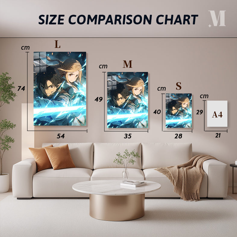 Kirito and Asuna from “Sword Art Online” are depicted in an action pose, with glowing blue energy effects around them. Metaleks Ultra HD Metal Poster – Create Your Passionate Space.