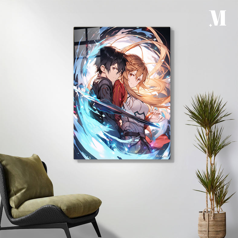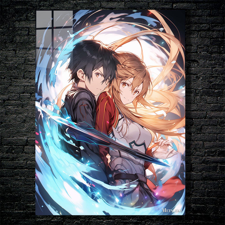 The image features Kirito and Asuna from the anime Sword Art Online. Kirito, with black hair, is wearing a dark outfit, while Asuna, with long blonde hair, is dressed in a red and white outfit. They are standing close together, with Asuna holding a sword. The background is filled with dynamic, swirling colors and light effects. Metaleks Ultra HD Metal Poster – Create Your Passionate Space.
