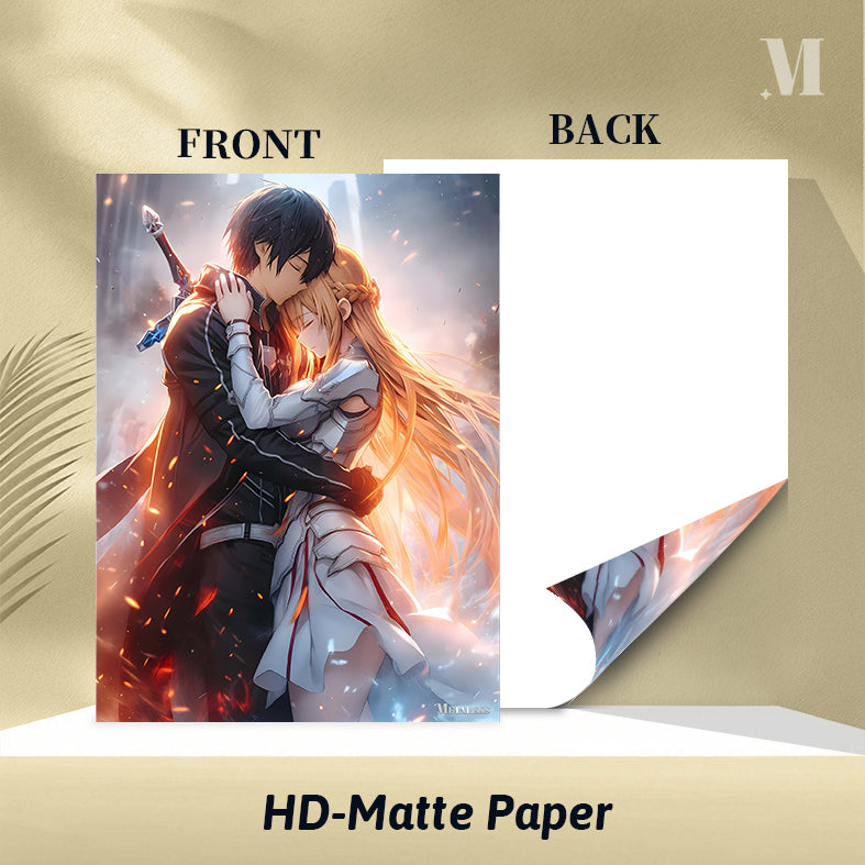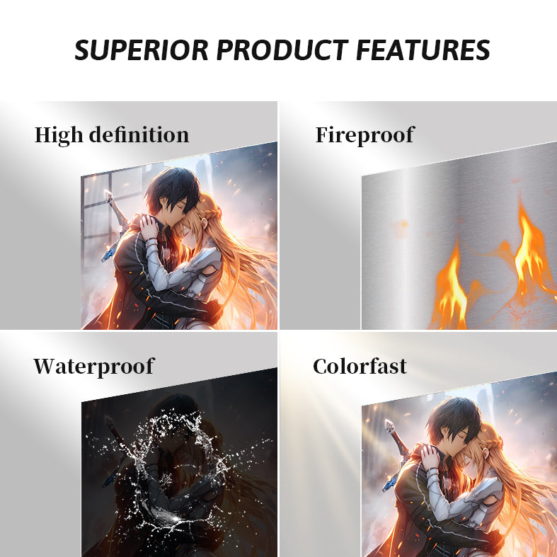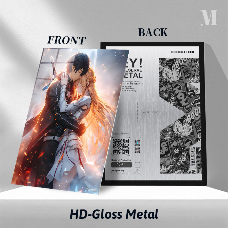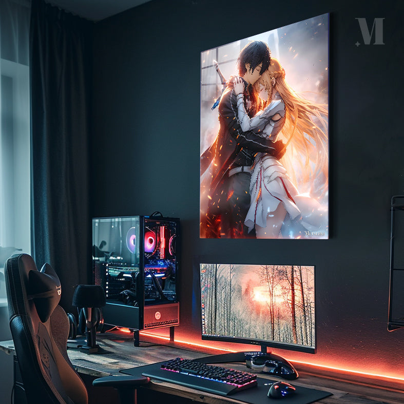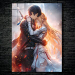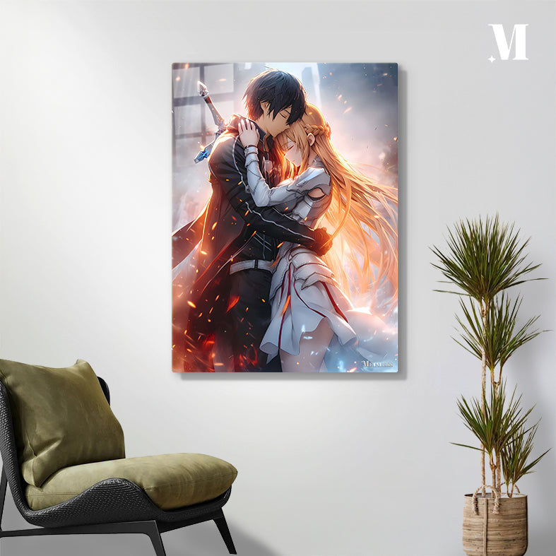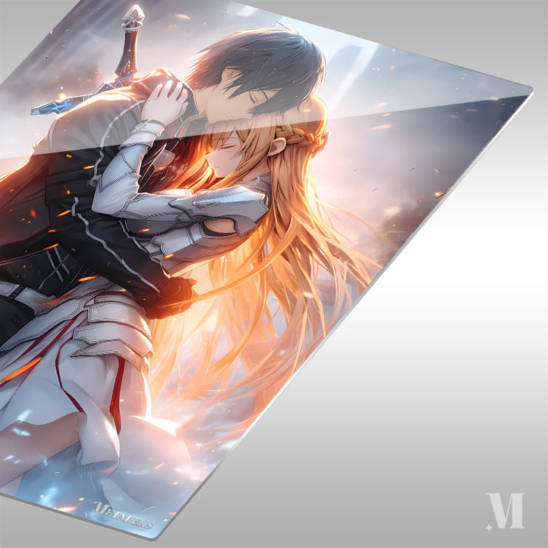 Kirito from “Sword Art Online” and Asuna from “Sword Art Online” are embracing each other. Metaleks Ultra HD Metal Poster – Create Your Passionate Space.