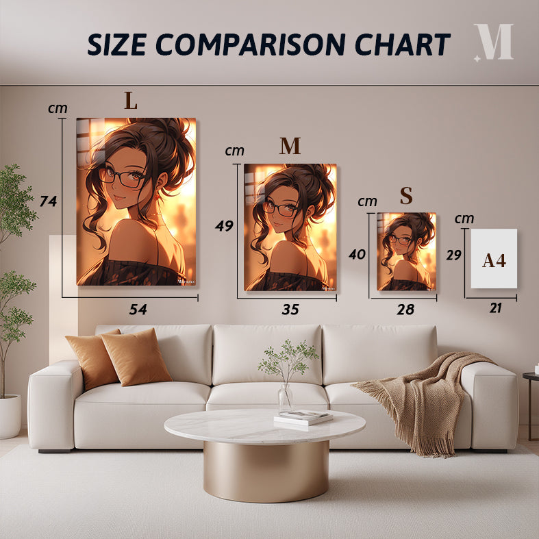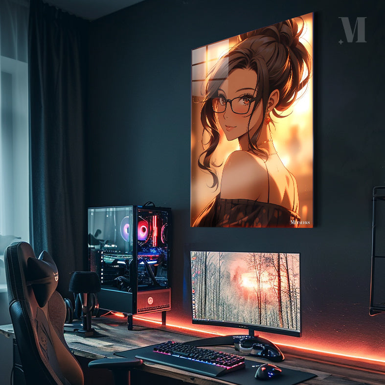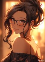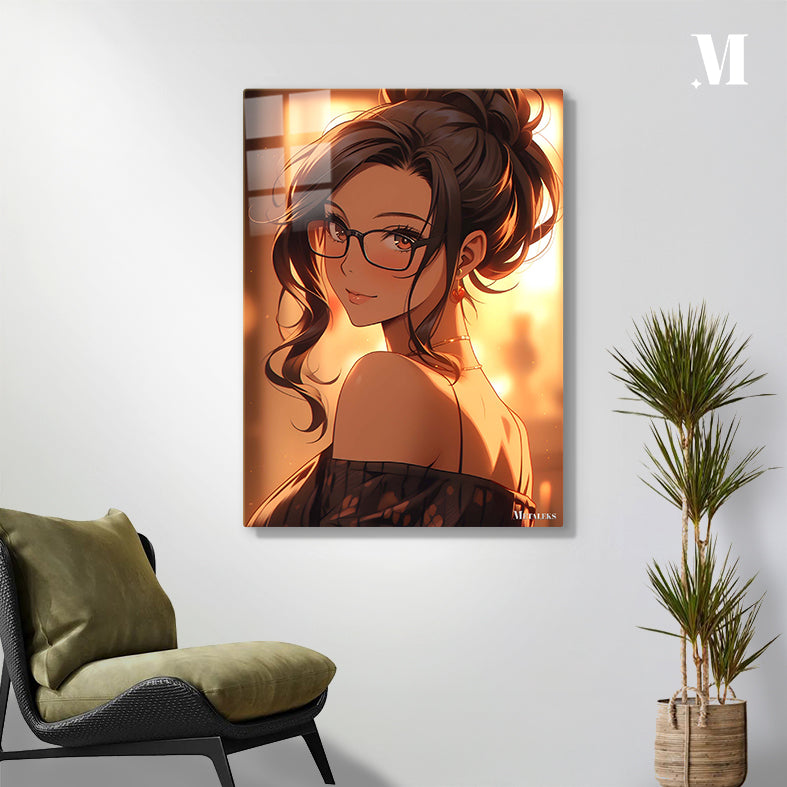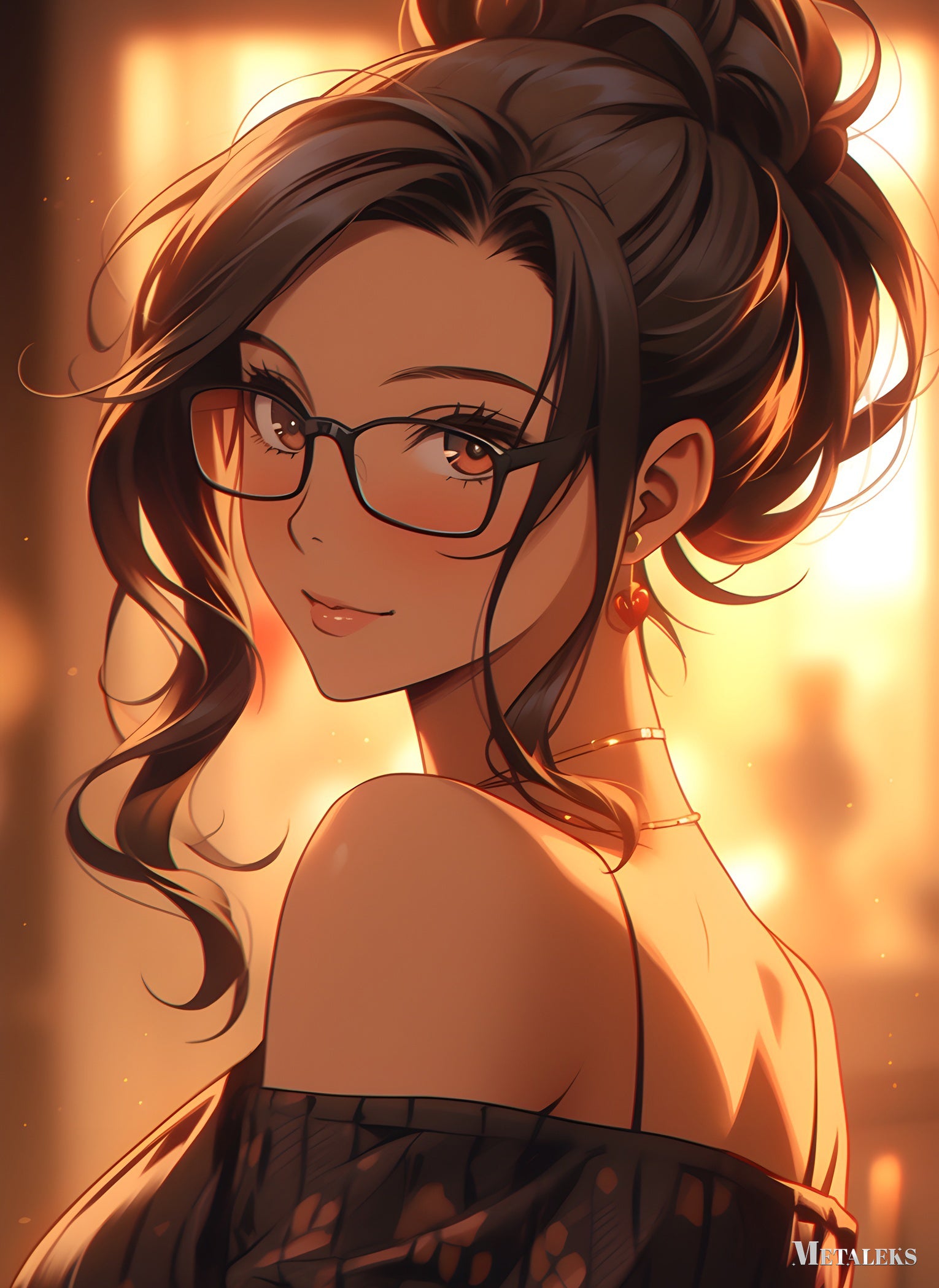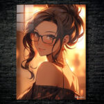 A woman with dark hair tied up in a bun, wearing glasses and a black off-the-shoulder top with a floral pattern. Metaleks Ultra HD Metal Poster – Create Your Passionate Space.