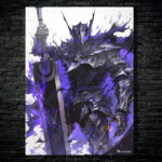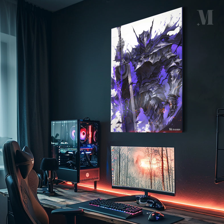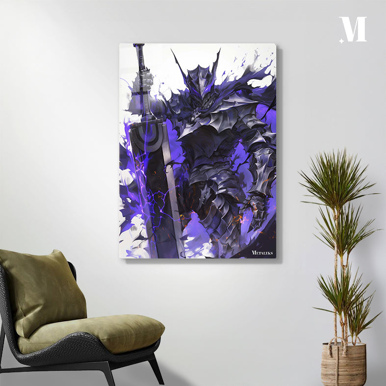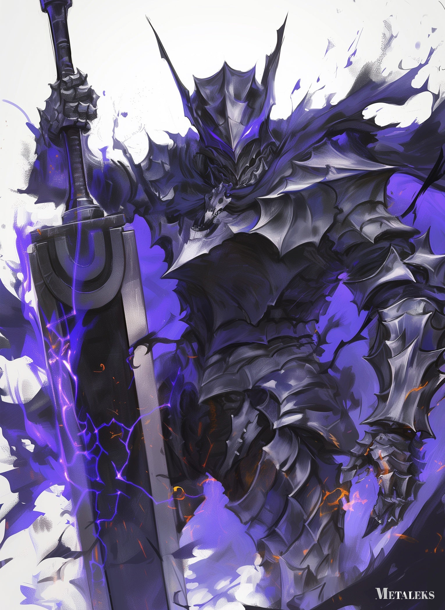 A knight clad in dark, spiked armor, holding a large, glowing sword with purple energy. Metaleks Ultra HD Metal Poster – Create Your Passionate Space.
