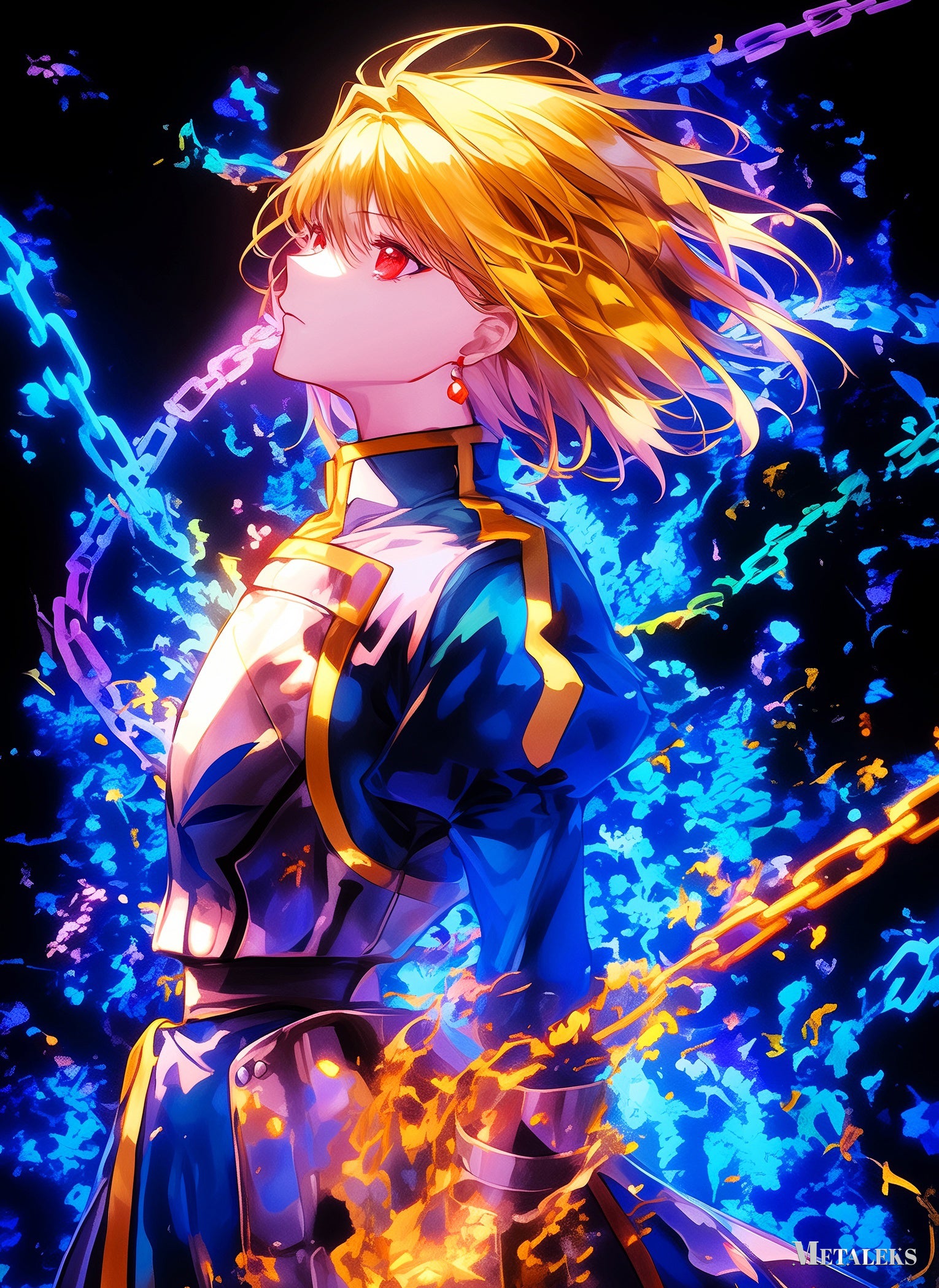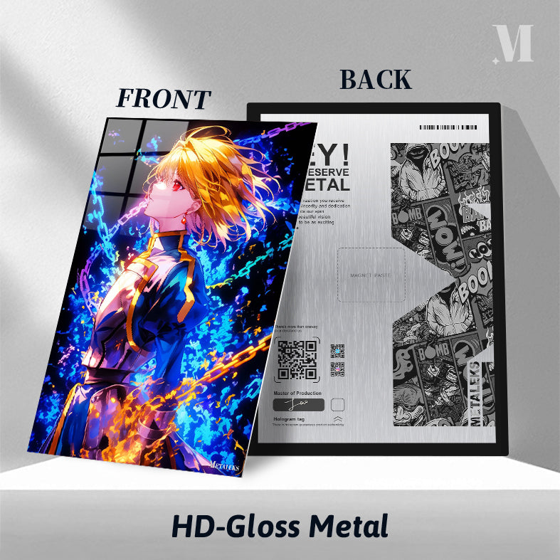 The image depicts Gilgamesh from the Fate series. He has golden hair and red eyes, wearing a blue and gold outfit. Chains are visible around him, and there are flames at his feet. Metaleks Ultra HD Metal Poster – Create Your Passionate Space.
