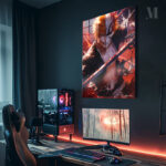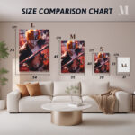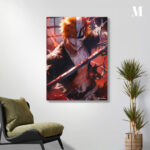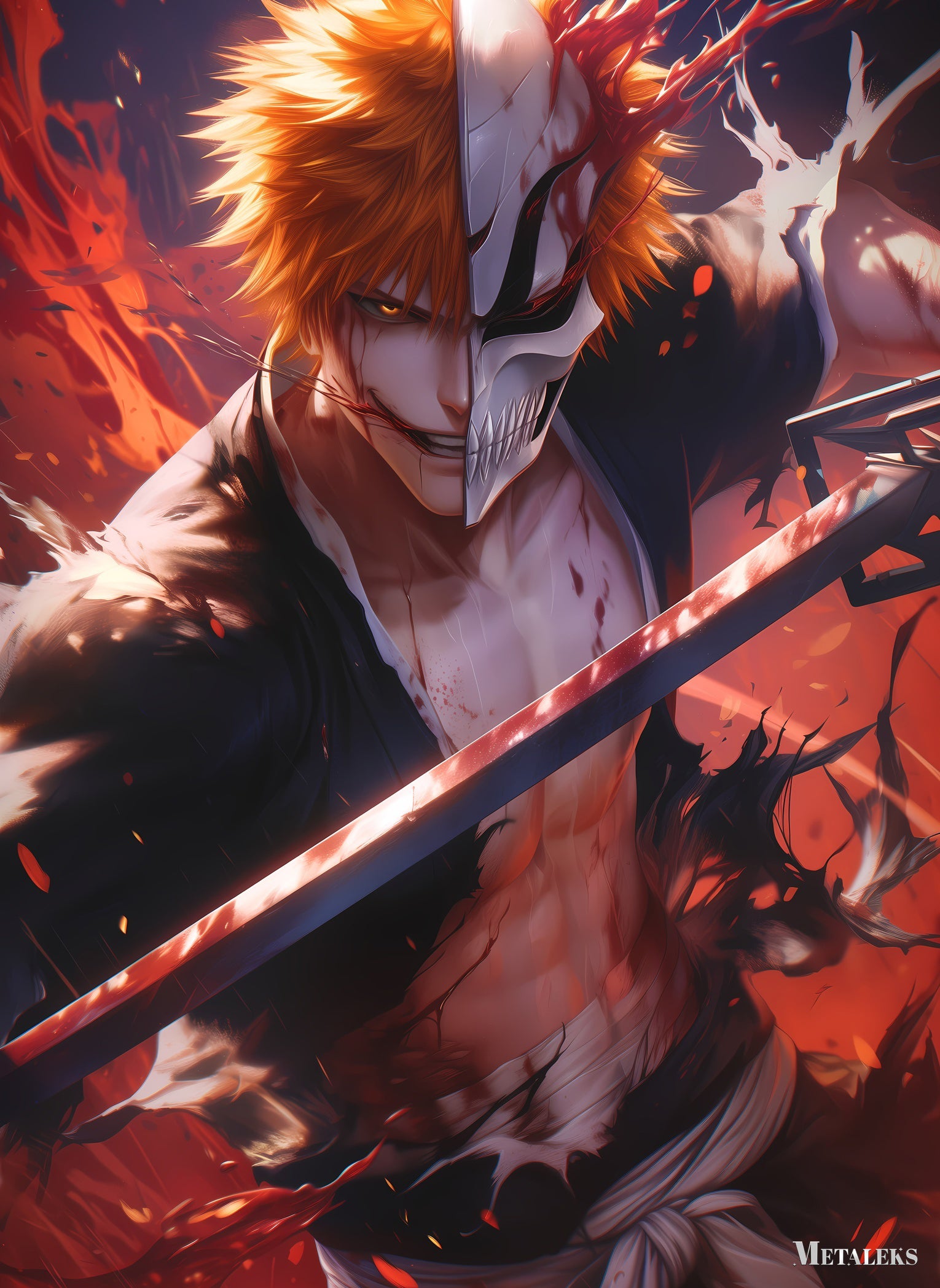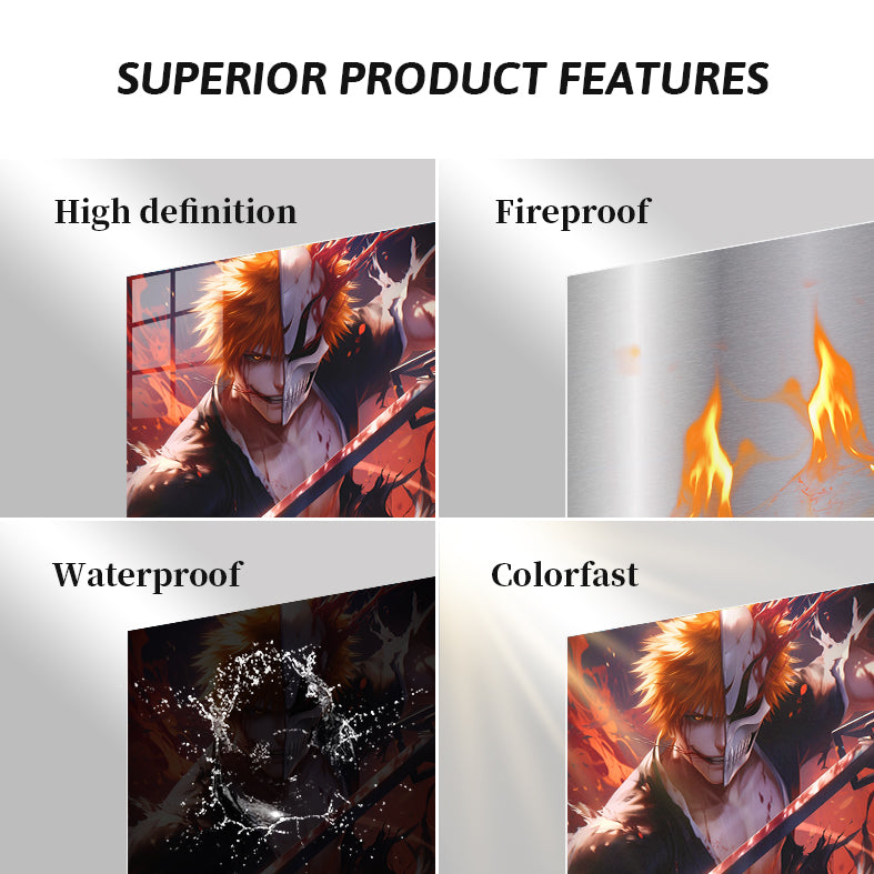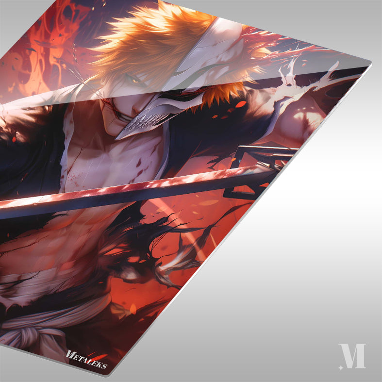 Ichigo Kurosaki from “Bleach” holds a sword, with half his face as a human and the other half as a hollow, surrounded by dynamic red and black effects. Metaleks Ultra HD Metal Poster – Create Your Passionate Space.