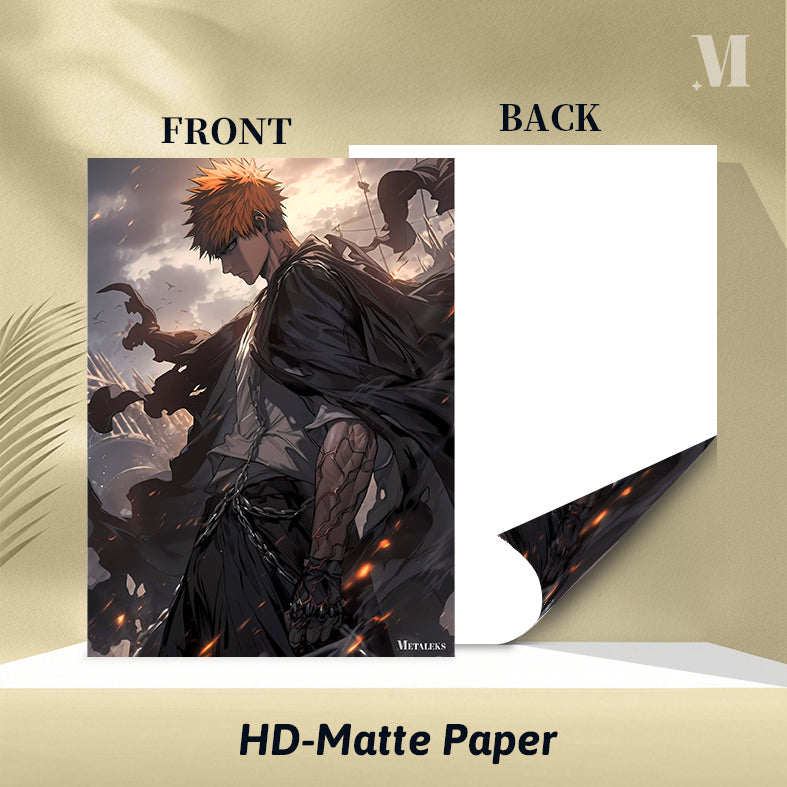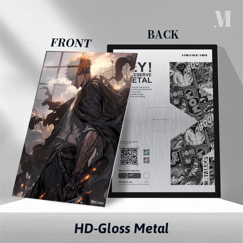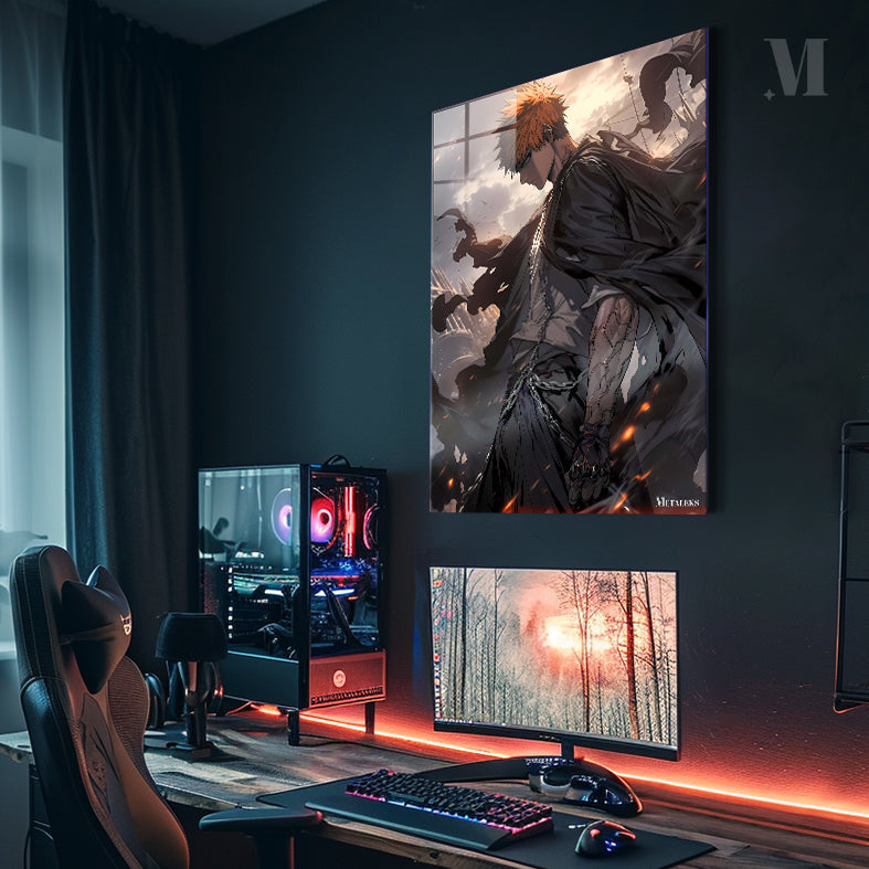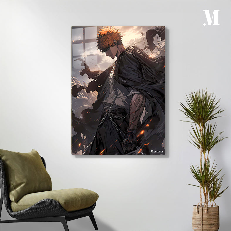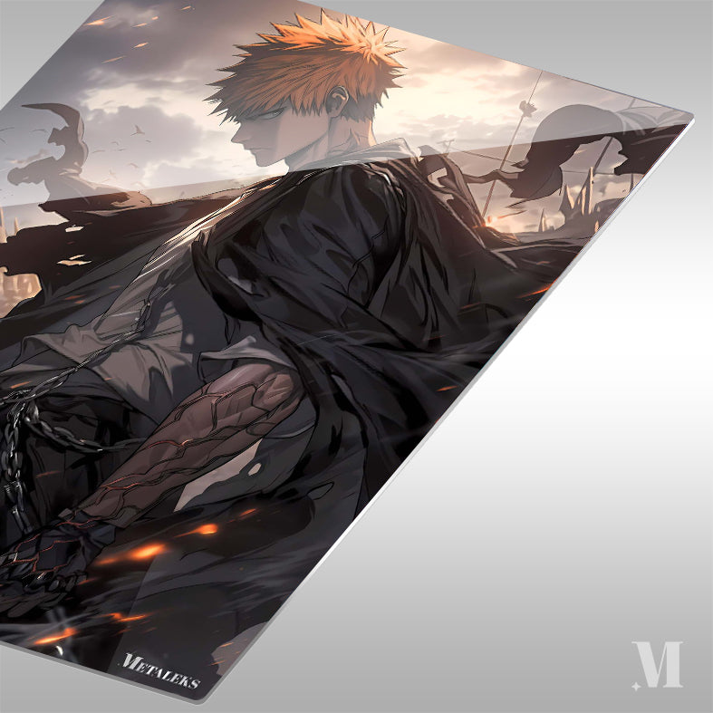 Ichigo Kurosaki from Bleach, with orange spiky hair, wears a dark cloak and has chains around his waist. His right arm is heavily scarred and armored, and he stands in a dynamic, action-oriented pose. Metaleks Ultra HD Metal Poster – Create Your Passionate Space.