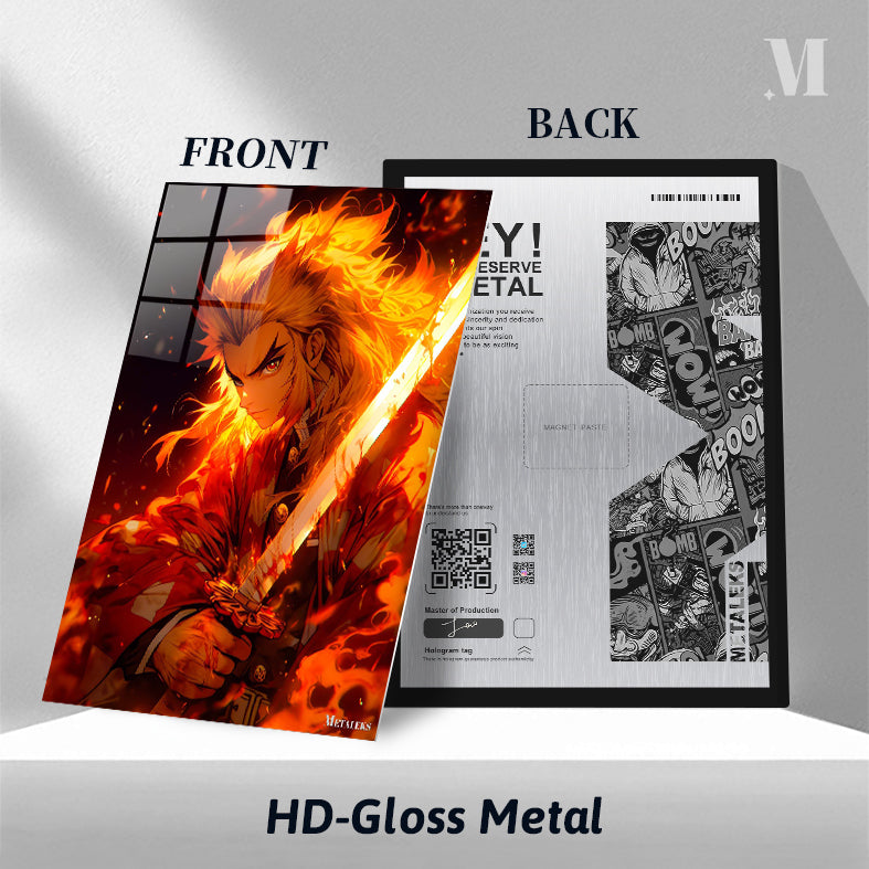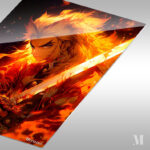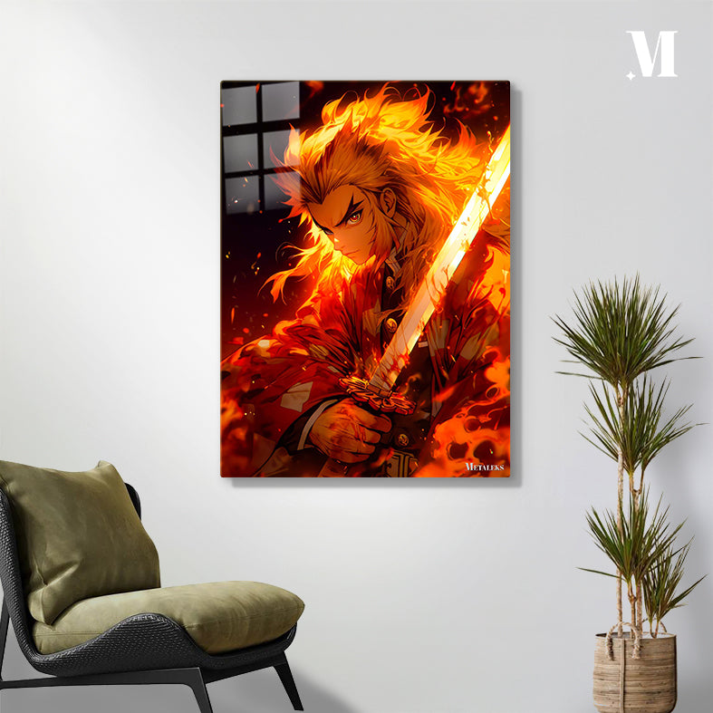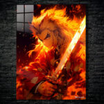 Rengoku Kyoujurou from Demon Slayer holds a sword surrounded by flames. Metaleks Ultra HD Metal Poster – Create Your Passionate Space.