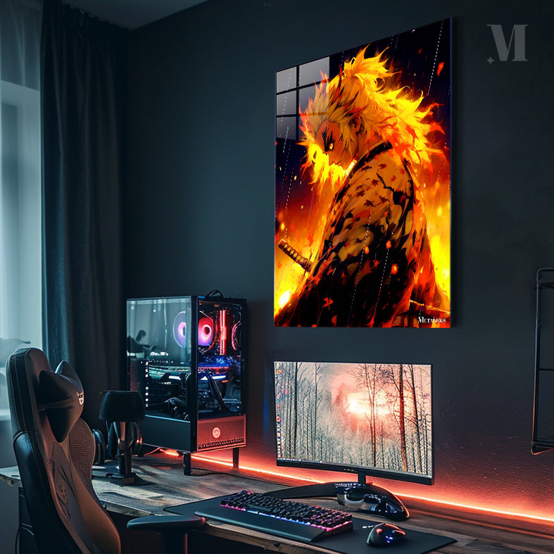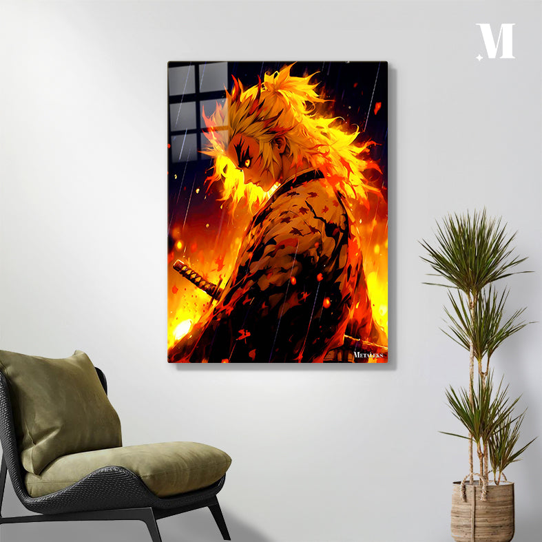 Kyojuro Rengoku from Demon Slayer has long, spiky blond hair with red tips, wearing a haori with a flame pattern. He holds a sword and is surrounded by intense flames. Metaleks Ultra HD Metal Poster – Create Your Passionate Space.