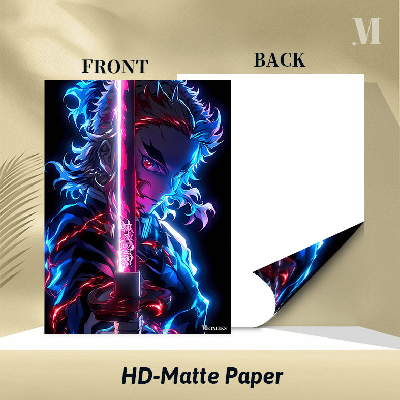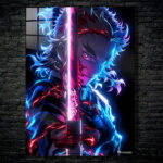 Tanjiro Kamado from “Demon Slayer” holds a sword with glowing pink and blue energy. Metaleks Ultra HD Metal Poster – Create Your Passionate Space.