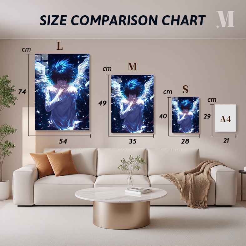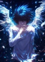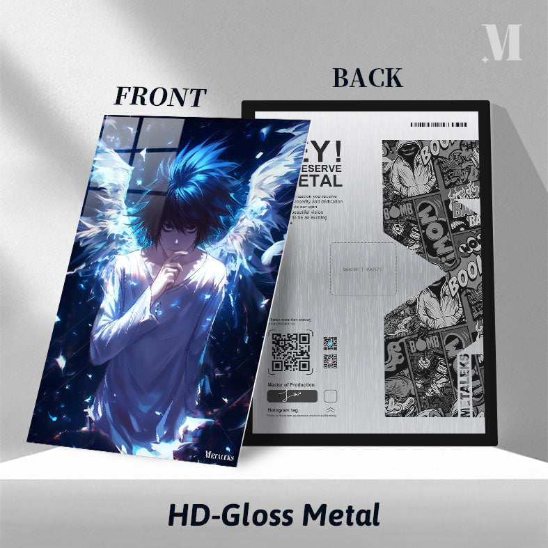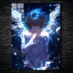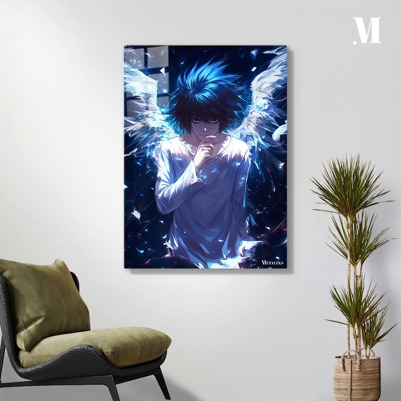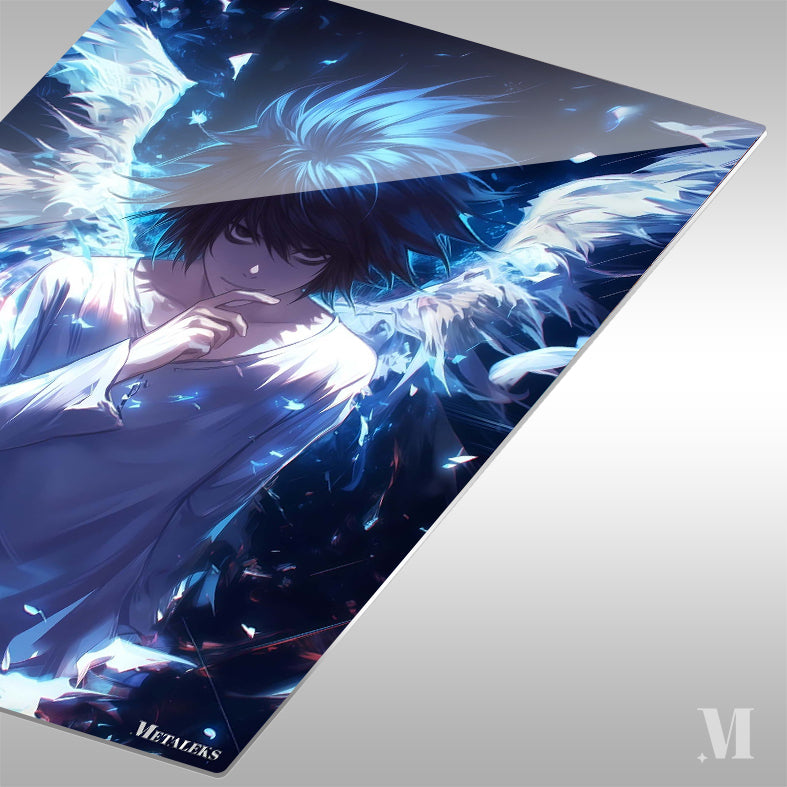 L is a character from the manga and anime series “Death Note.” In this image, L has blue hair and is wearing a light-colored shirt. He has his right hand raised to his chin in a thoughtful pose. Behind him, there are large, white wings that appear to be glowing. The overall atmosphere of the image is dark and mysterious, with a blue hue dominating the scene. Metaleks Ultra HD Metal Poster – Create Your Passionate Space.