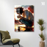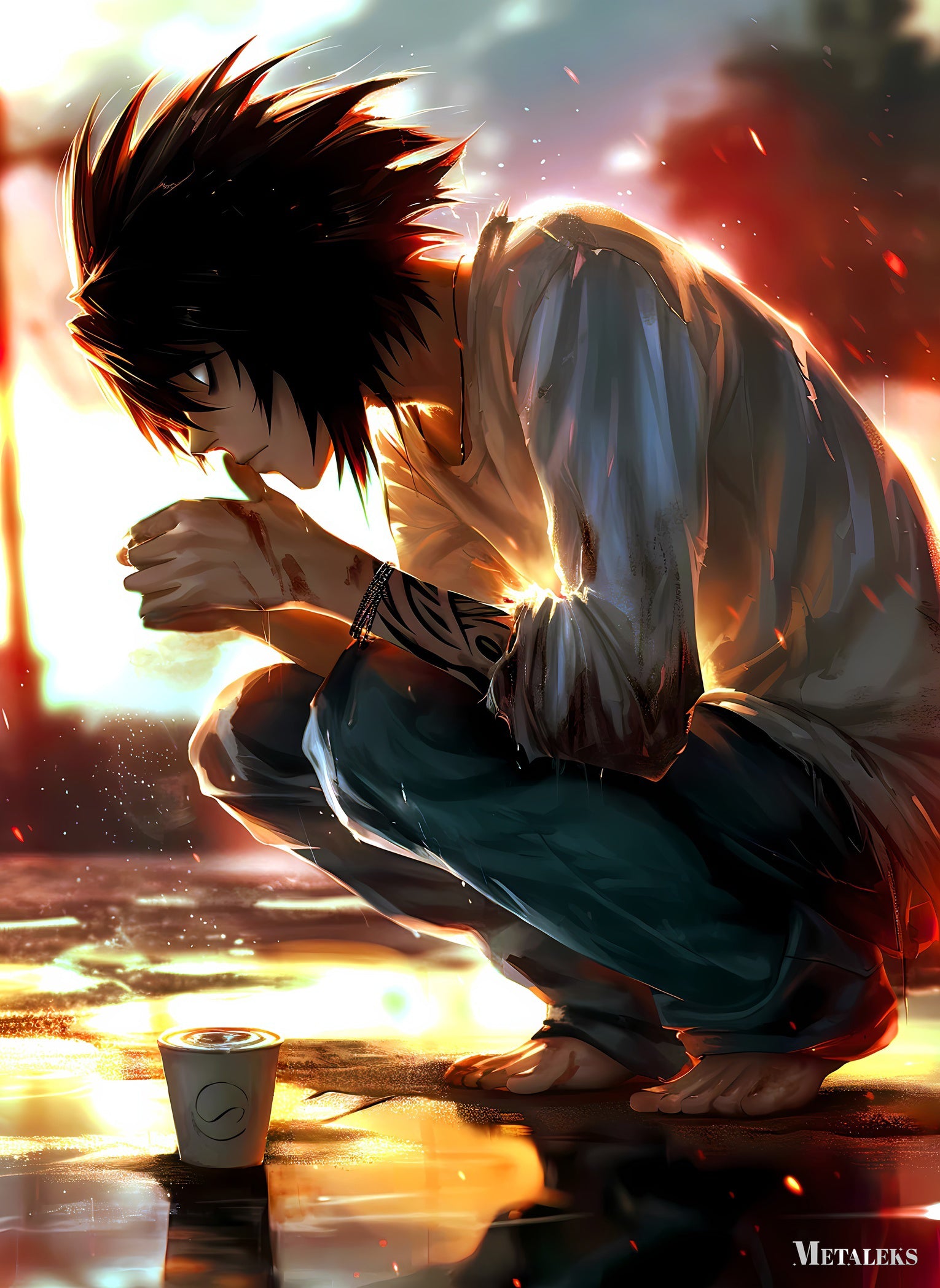 Light Yagami from “Death Note” is crouching on the ground. He has a hand near his mouth and appears to be in deep thought. Metaleks Ultra HD Metal Poster – Create Your Passionate Space.