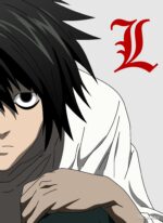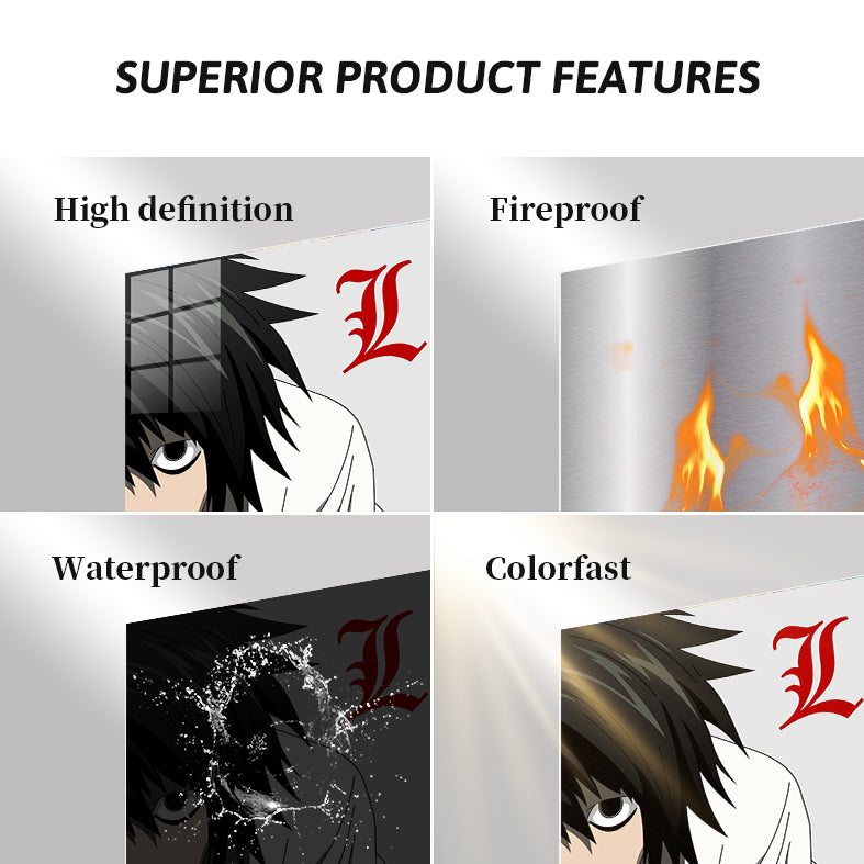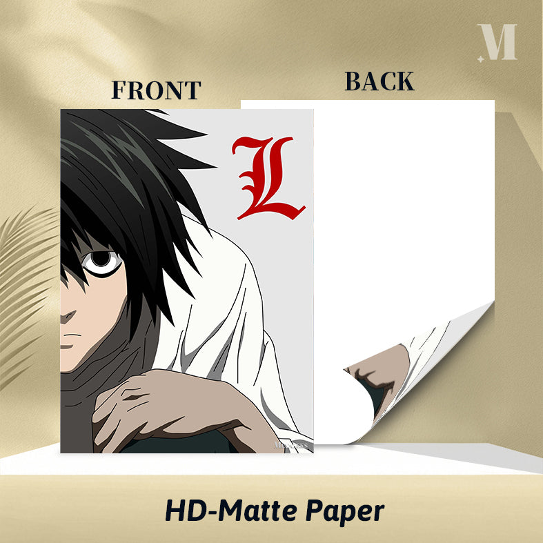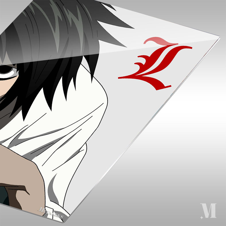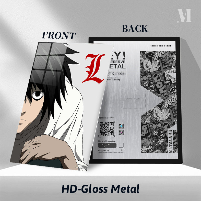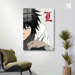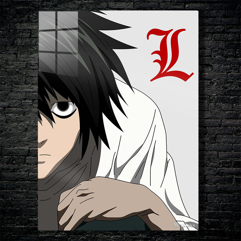 The image features L from the anime “Death Note.” He has black hair and is wearing a white shirt. There is a red stylized “L” symbol next to him. Metaleks Ultra HD Metal Poster – Create Your Passionate Space.