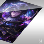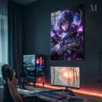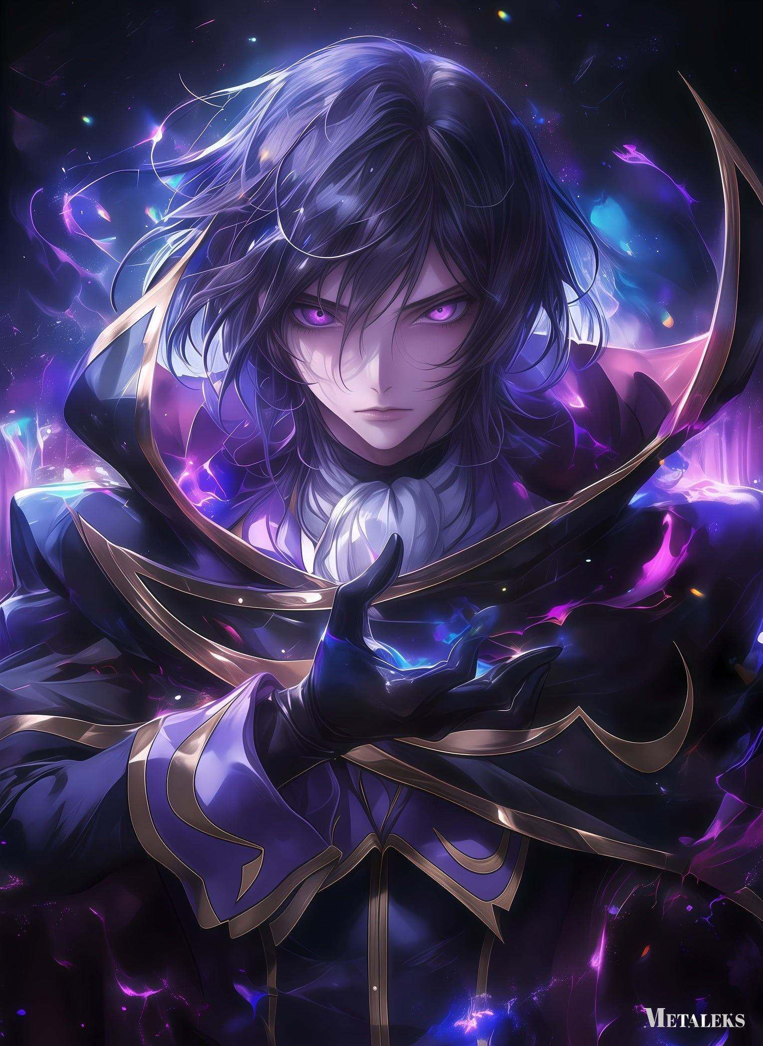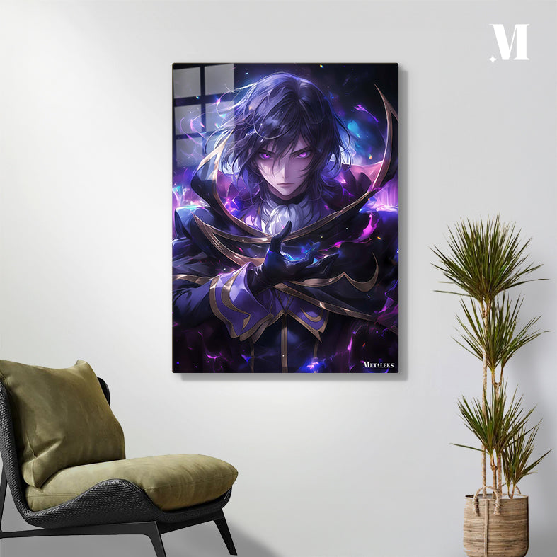 A character with long dark hair and glowing purple eyes, wearing a dark, ornate outfit with gold accents, holds a glowing blue object in their hand. Metaleks Ultra HD Metal Poster – Create Your Passionate Space.