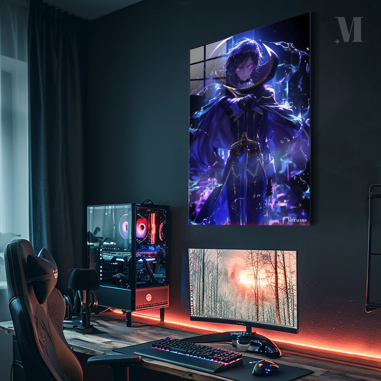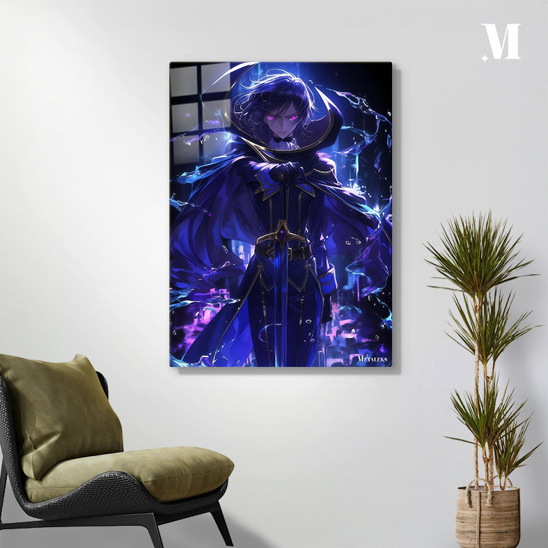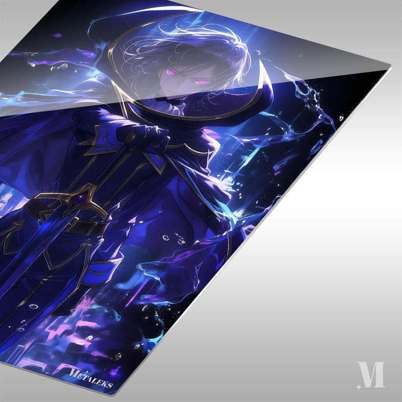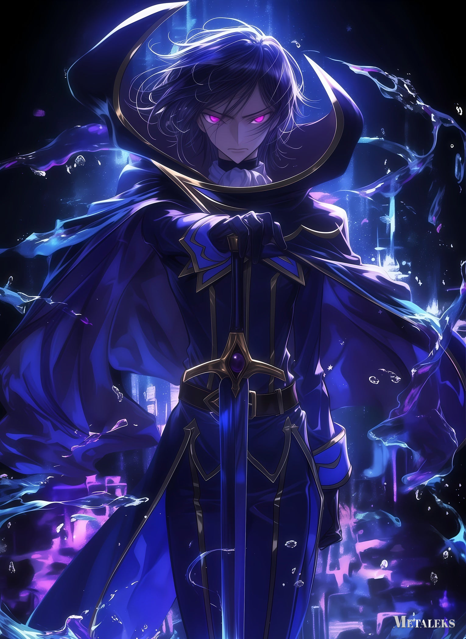 A character with long, flowing hair and glowing pink eyes, dressed in a dark blue robe with gold accents, holding a sword. Metaleks Ultra HD Metal Poster – Create Your Passionate Space.