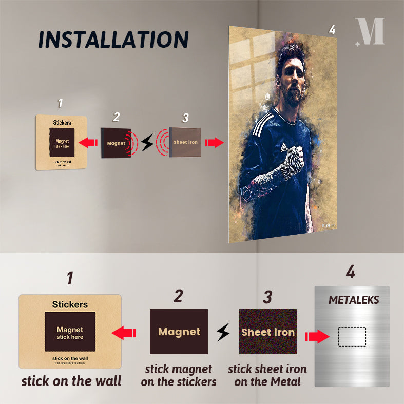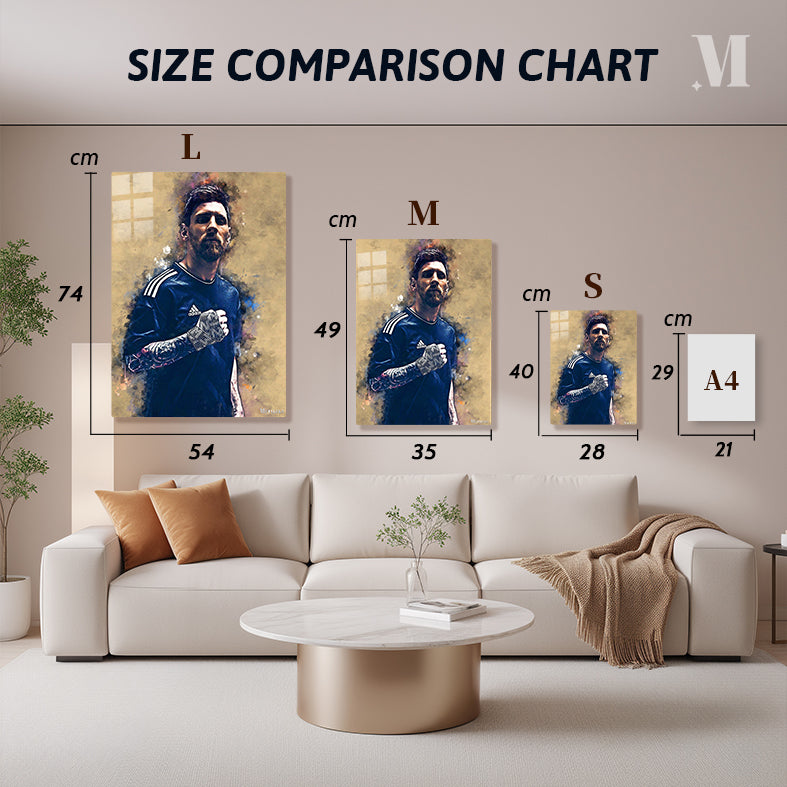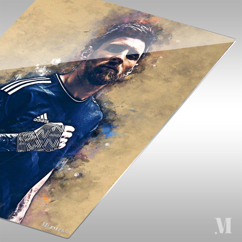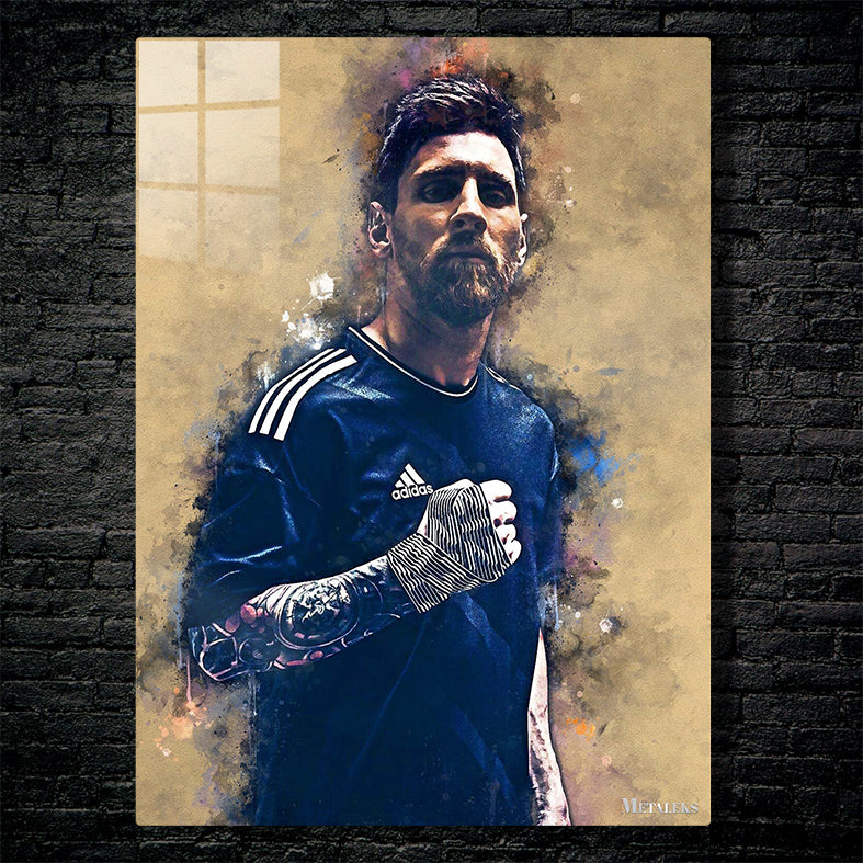 Lionel Messi is wearing a dark blue Adidas jersey with white stripes on the shoulders. He has a tattoo on his left arm and is wearing a black and white striped armband on his right arm. Metaleks Ultra HD Metal Poster – Create Your Passionate Space.