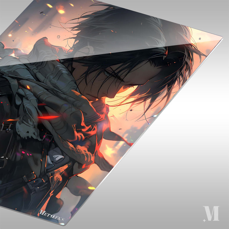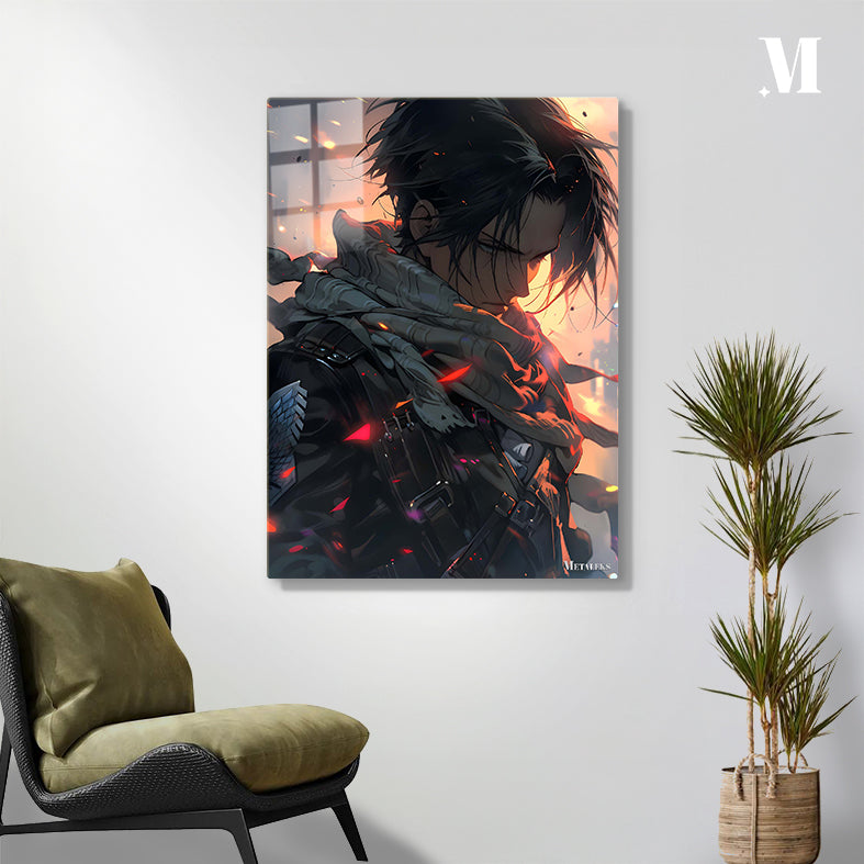 The image depicts a character with dark, tousled hair and a scarf draped around their neck. The character is wearing a dark, tactical outfit with visible straps and buckles. The background features a warm, orange glow with particles and debris, suggesting a dynamic or intense scene. Metaleks Ultra HD Metal Poster – Create Your Passionate Space.