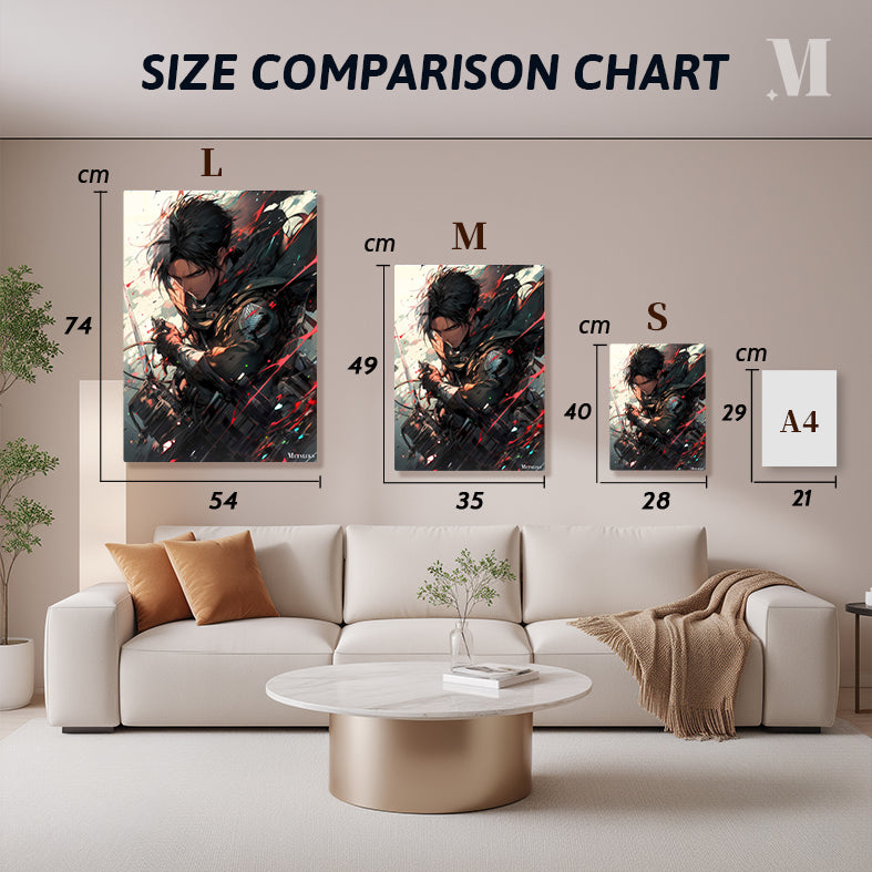 Levi from Attack on Titan is shown in an intense pose, wielding weapons. Metaleks Ultra HD Metal Poster – Create Your Passionate Space.