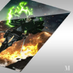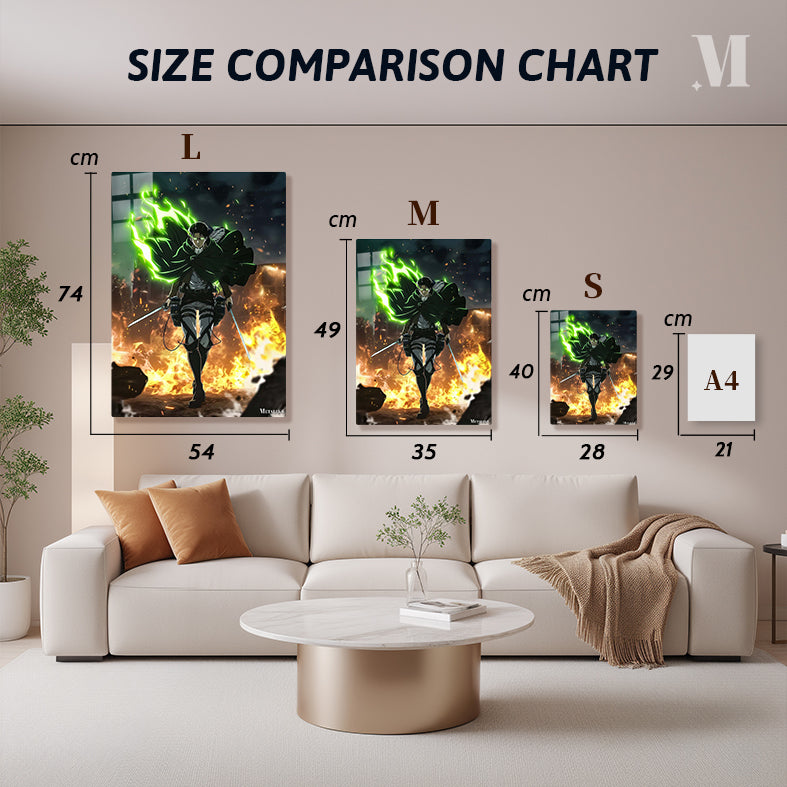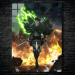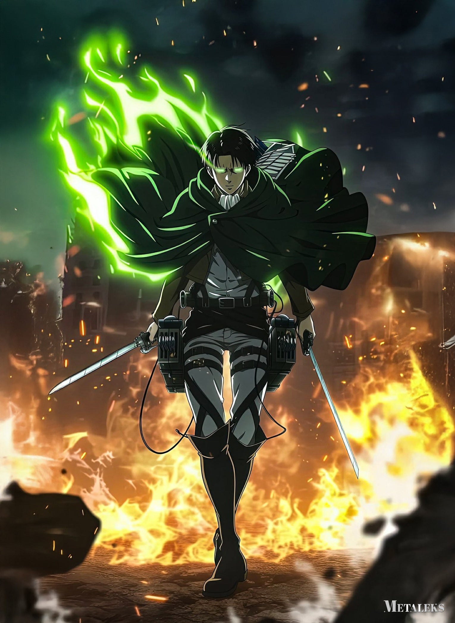 Levi from “Attack on Titan” is depicted with green flames around his cape, holding swords, and standing amidst flames. Metaleks Ultra HD Metal Poster – Create Your Passionate Space.