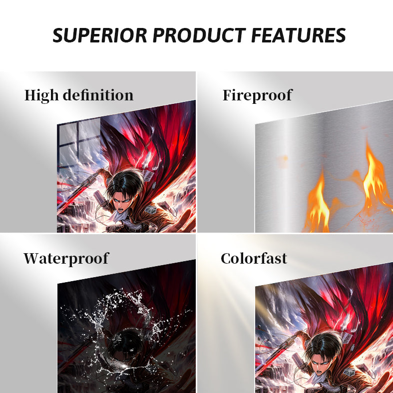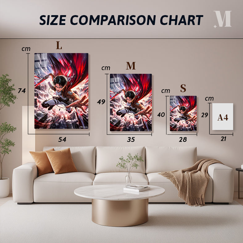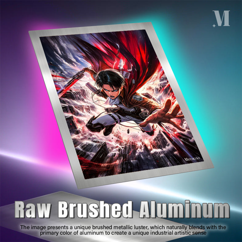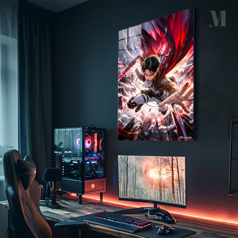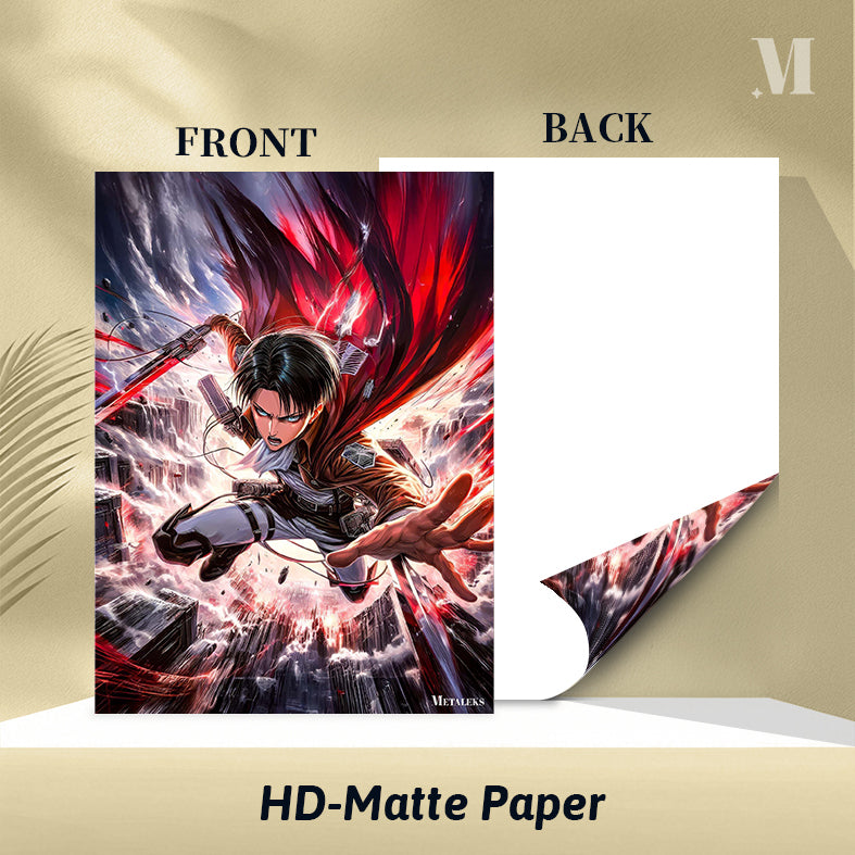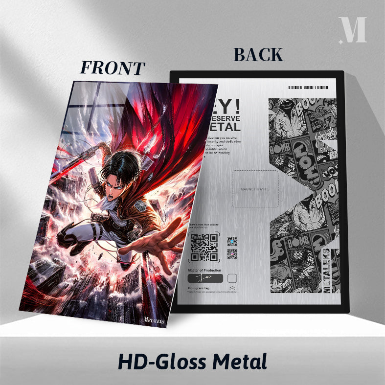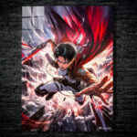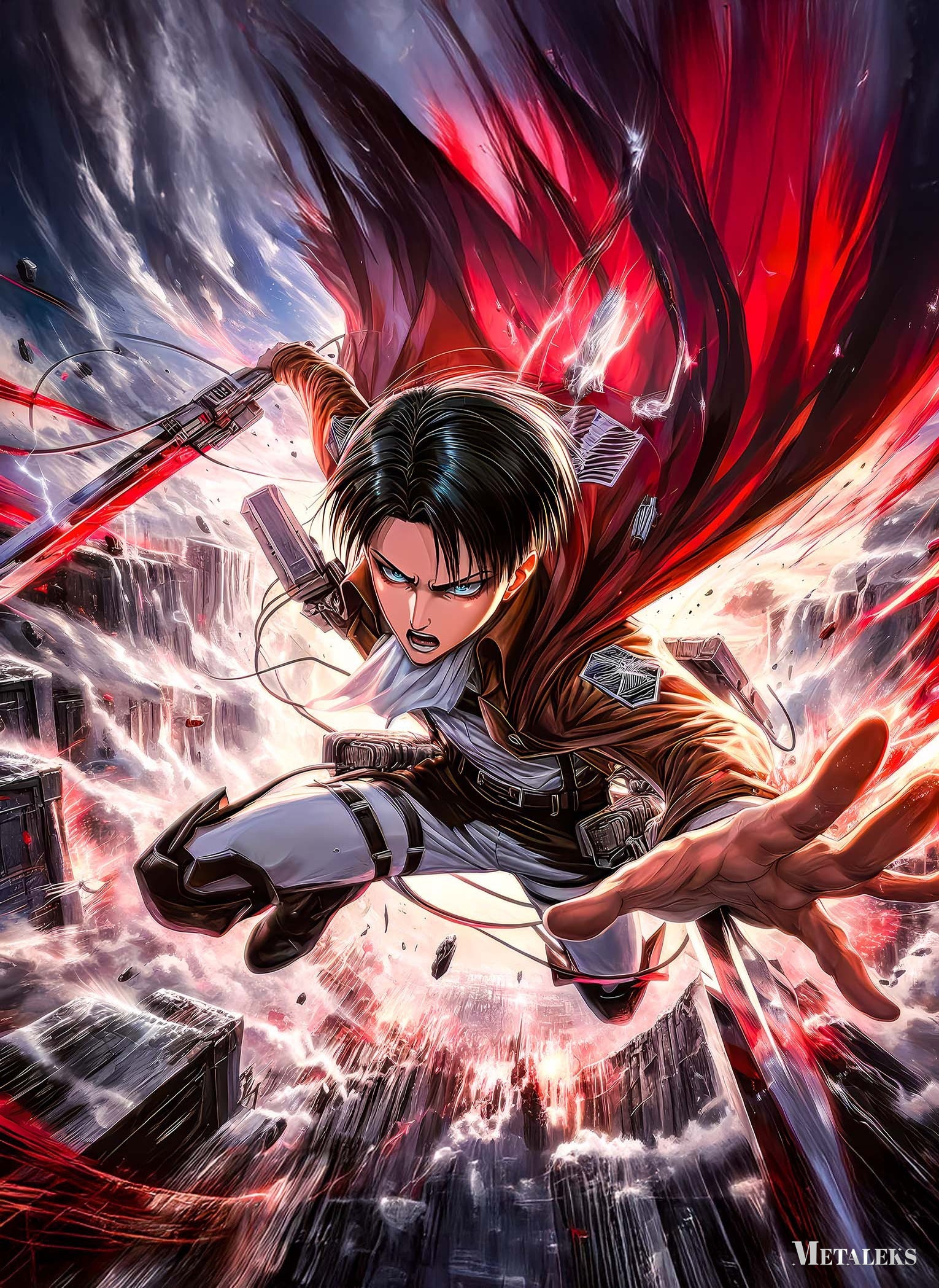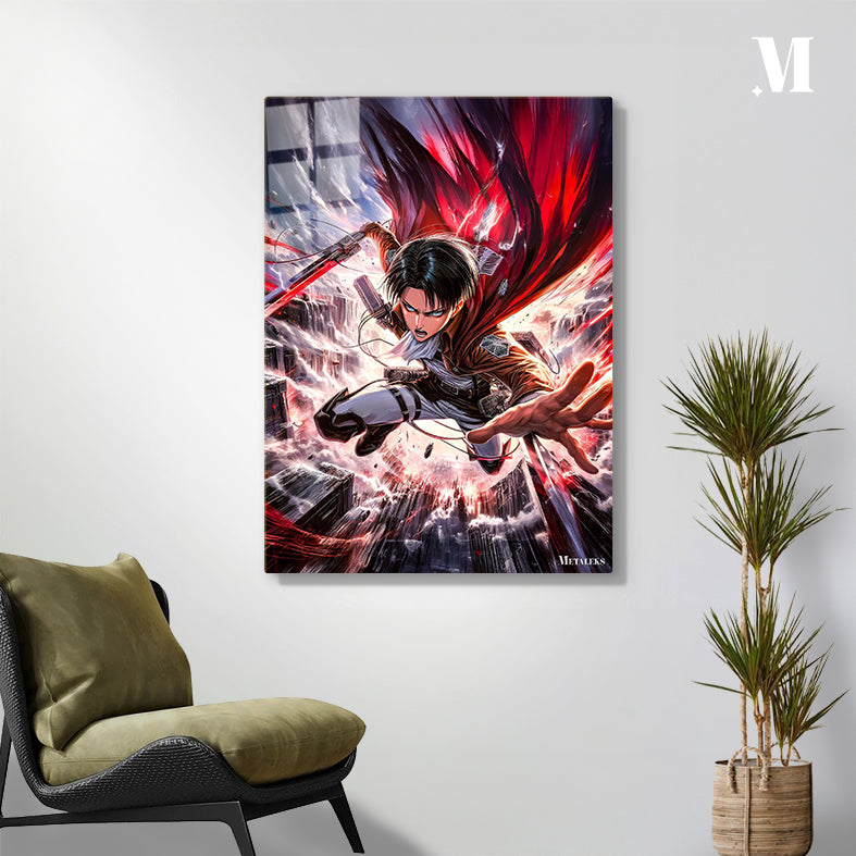 Levi from Attack on Titan is depicted in mid-action, wielding a sword with a red blade. He is wearing a brown jacket, white shirt, and white pants with black straps. His expression is intense, and his cape is flowing dramatically behind him. Metaleks Ultra HD Metal Poster – Create Your Passionate Space.